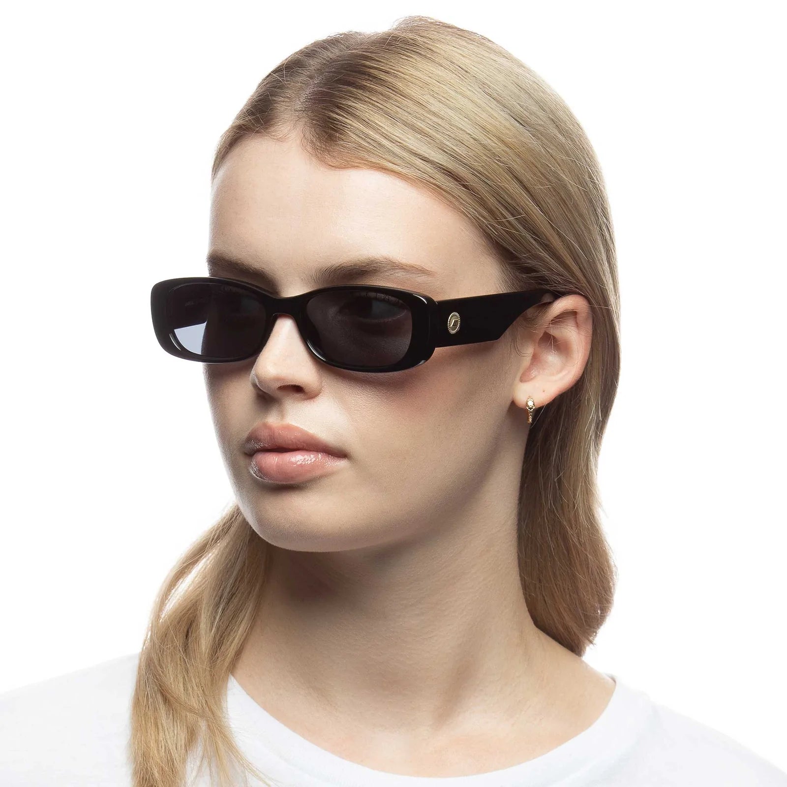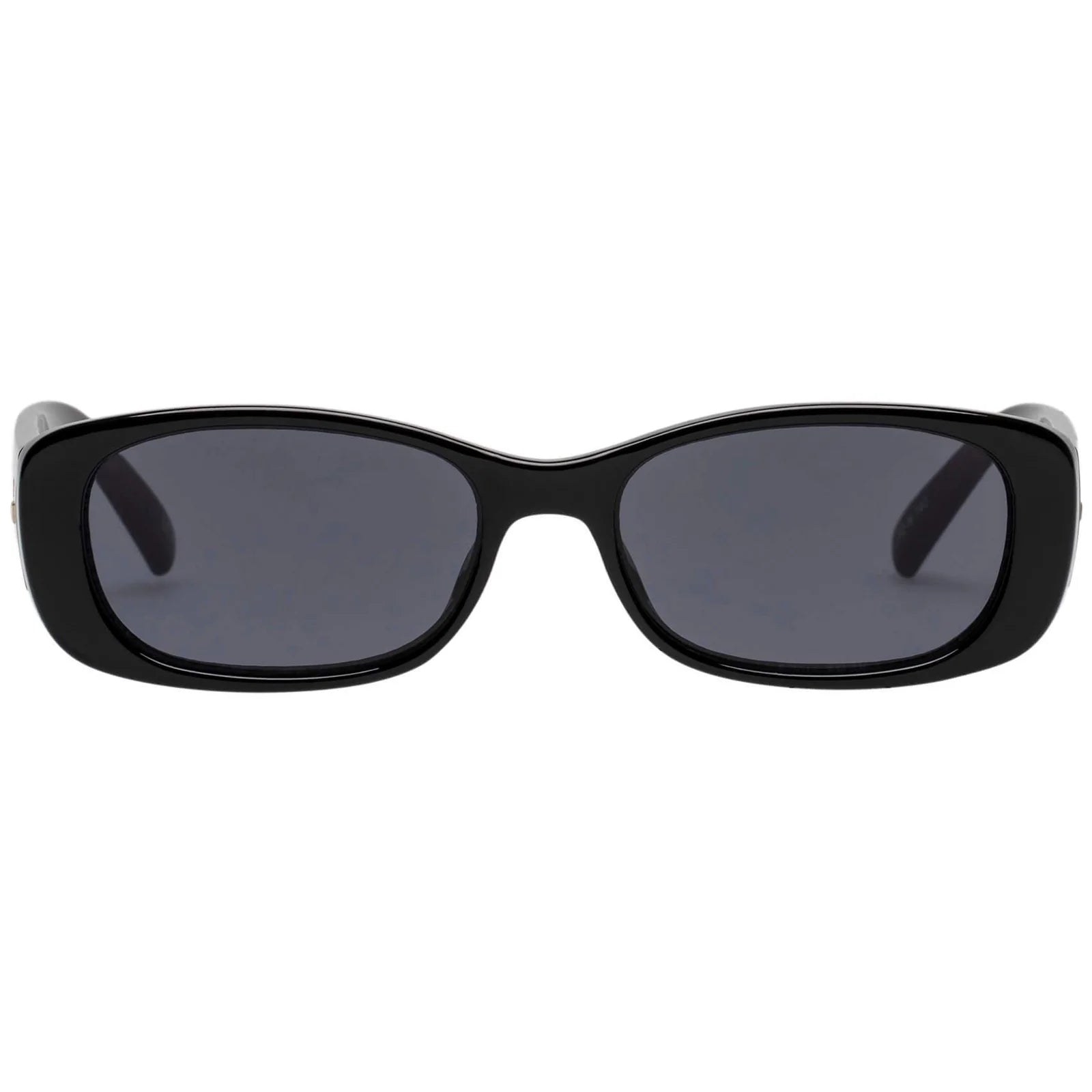 Unreal is minimal yet bold. This shiny black rectangular sunglass offers a cool nineties look. Finished with bold thick-profile temples and iconic Le Specs rope textured metal hardware.
