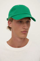 The Everyday Cap in bright green is a 100% cotton, unstructured six-panel cap with a curved visor, embroidered branding, and an adjustable brass closure.