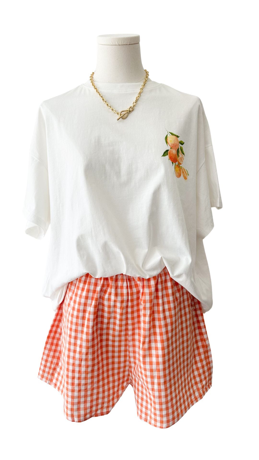 Keep it cute and comfy with our Aperol Vibes Set! This effortless combo features a relaxed-fit white tee with aperol orange (because we love a little fruity detail) and breezy orange gingham shorts that scream summer fun. Whether you’re lounging at home, running weekend errands, or grabbing brunch with your besties, this set is your go-to for easy, stylish vibes. Pair it with sneakers for a casual day out or dress it up with chunky jewelry—either way, you’re serving effortless charm.