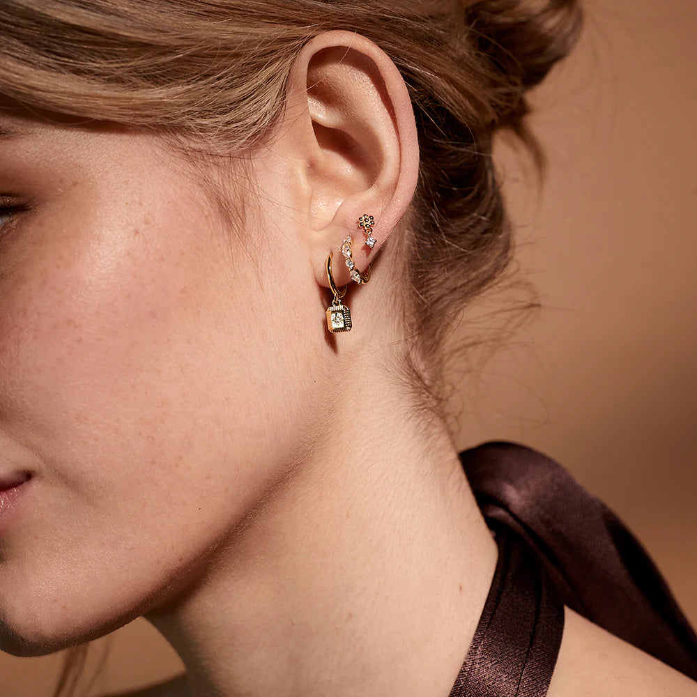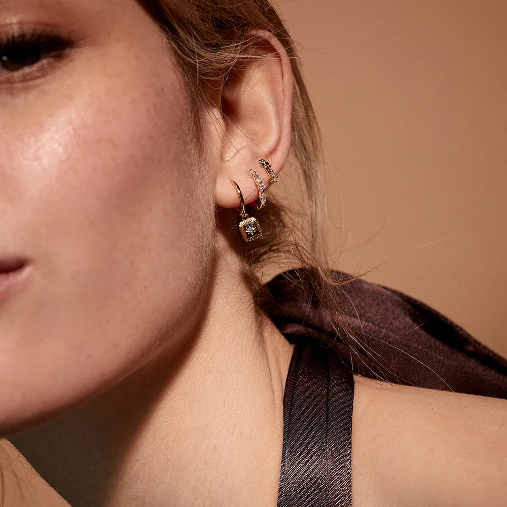 Look no further than the Kris Sleepers for a sparkling addition to your wardrobe. Its delicate square shaped charm with crystal will add a touch of bohemian luxe to your outfit. Timeless and classic, perfect for layering.