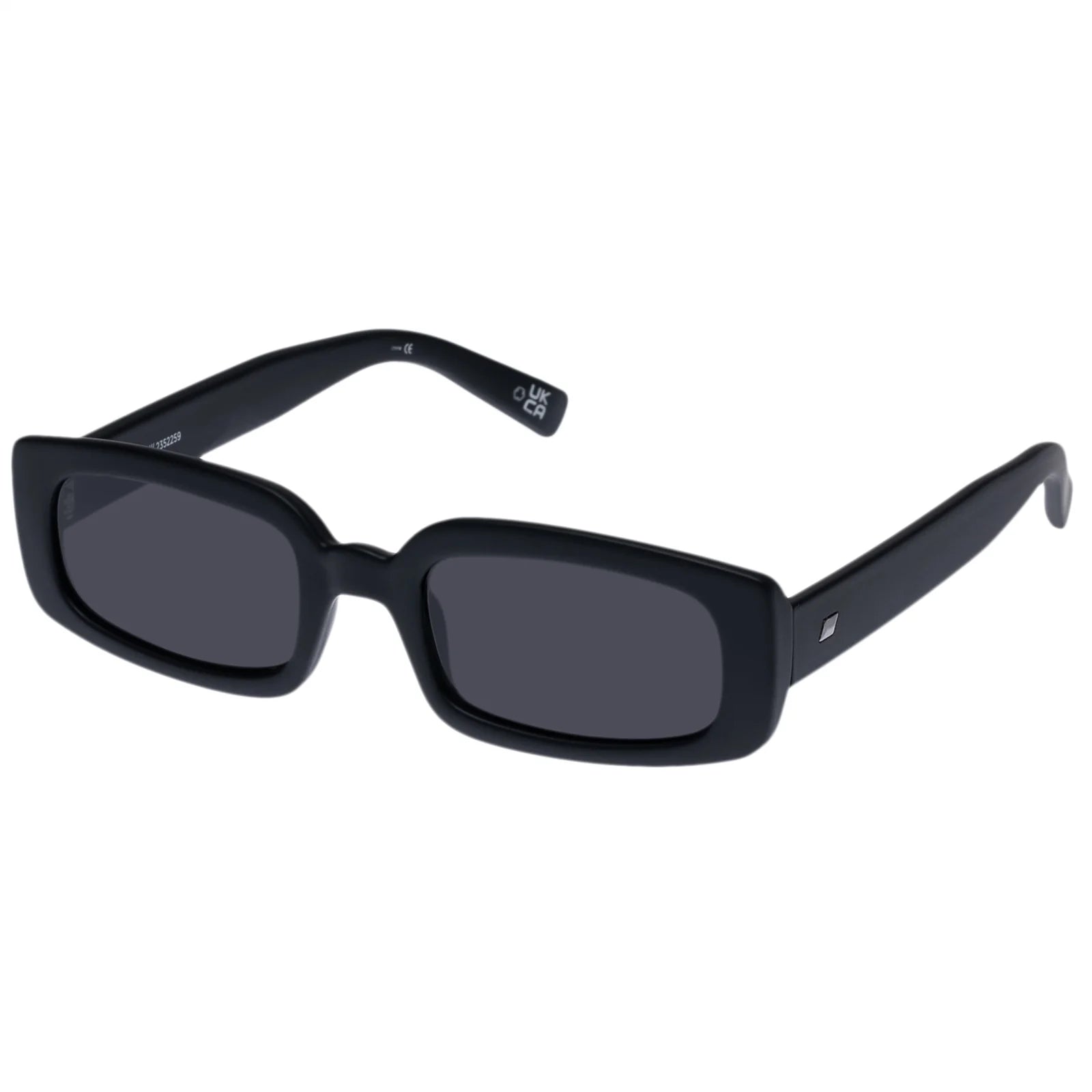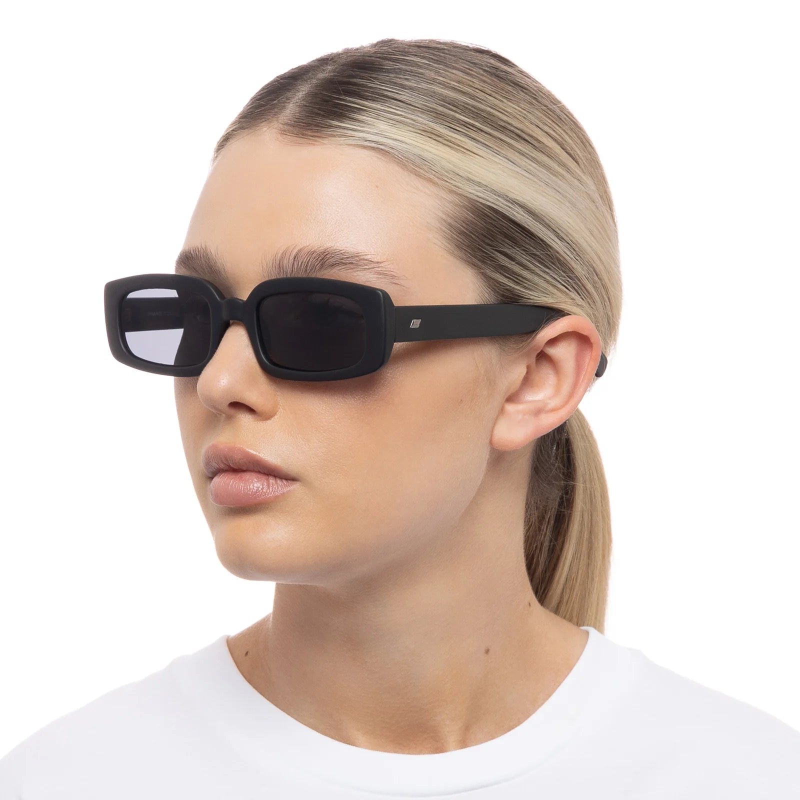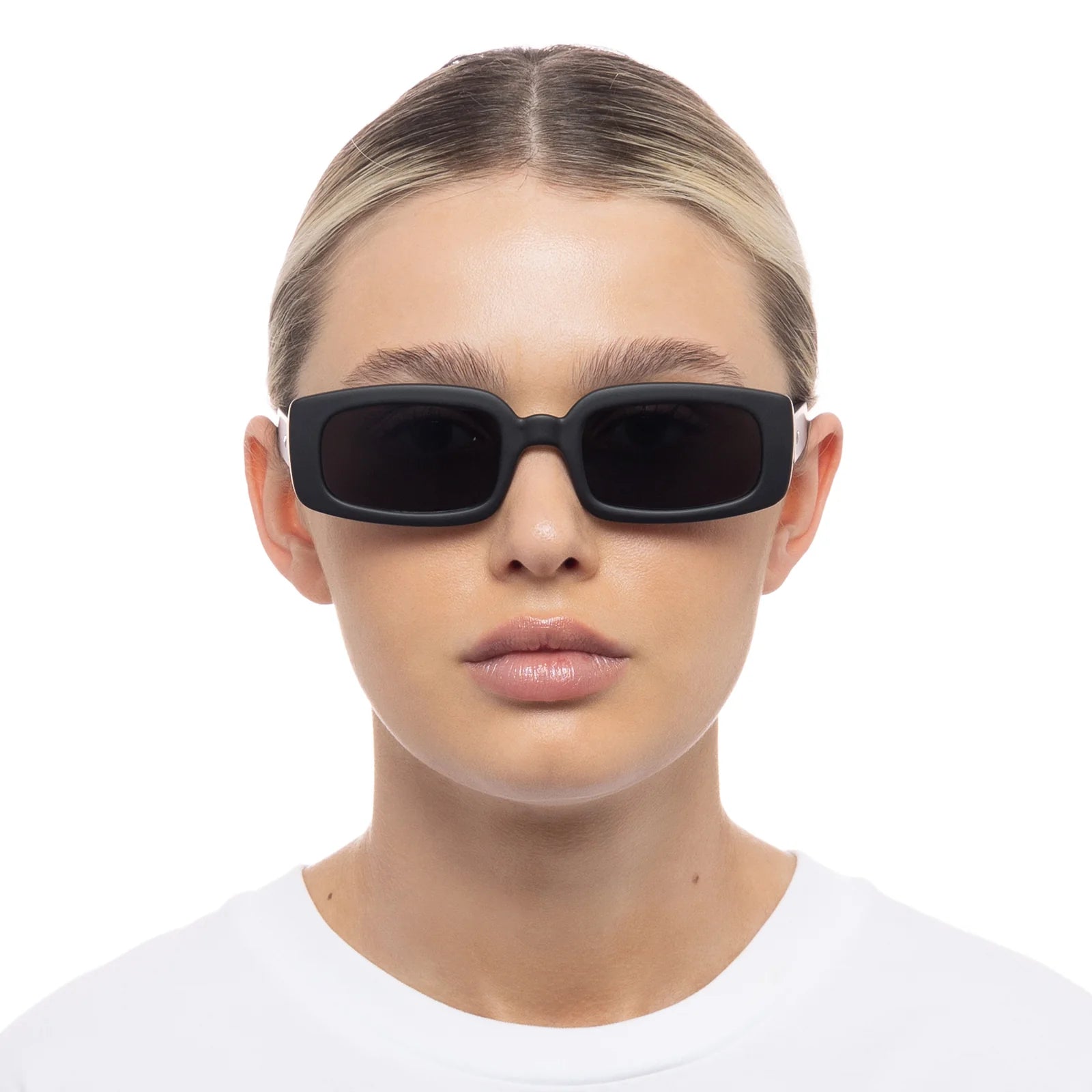 Designed with narrow proportions and wide fit for all face sizes, our DYNAMITE rectangular frame sunglasses are a wardrobe staple for both guys and girls. Featuring a classic noughties-inspired look, this unisex sunglass features discreet Le Specs metal stud detailing on both temples.