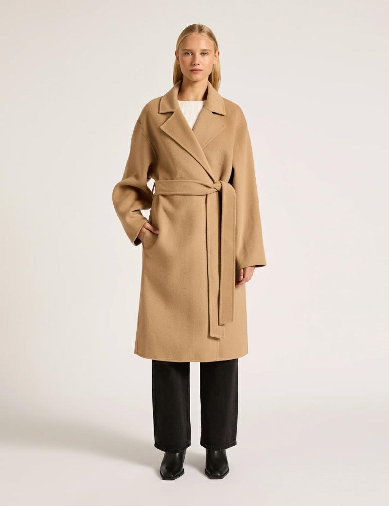 The Darcy Wool Coat is made from a classic thick wool blend fabrication which has a soft, warm hand feel. The silhouette is relaxed with a lapel collar, dropped shoulder and length finishing above the ankles. Features include self tie at waist, side seam pockets and back vent.