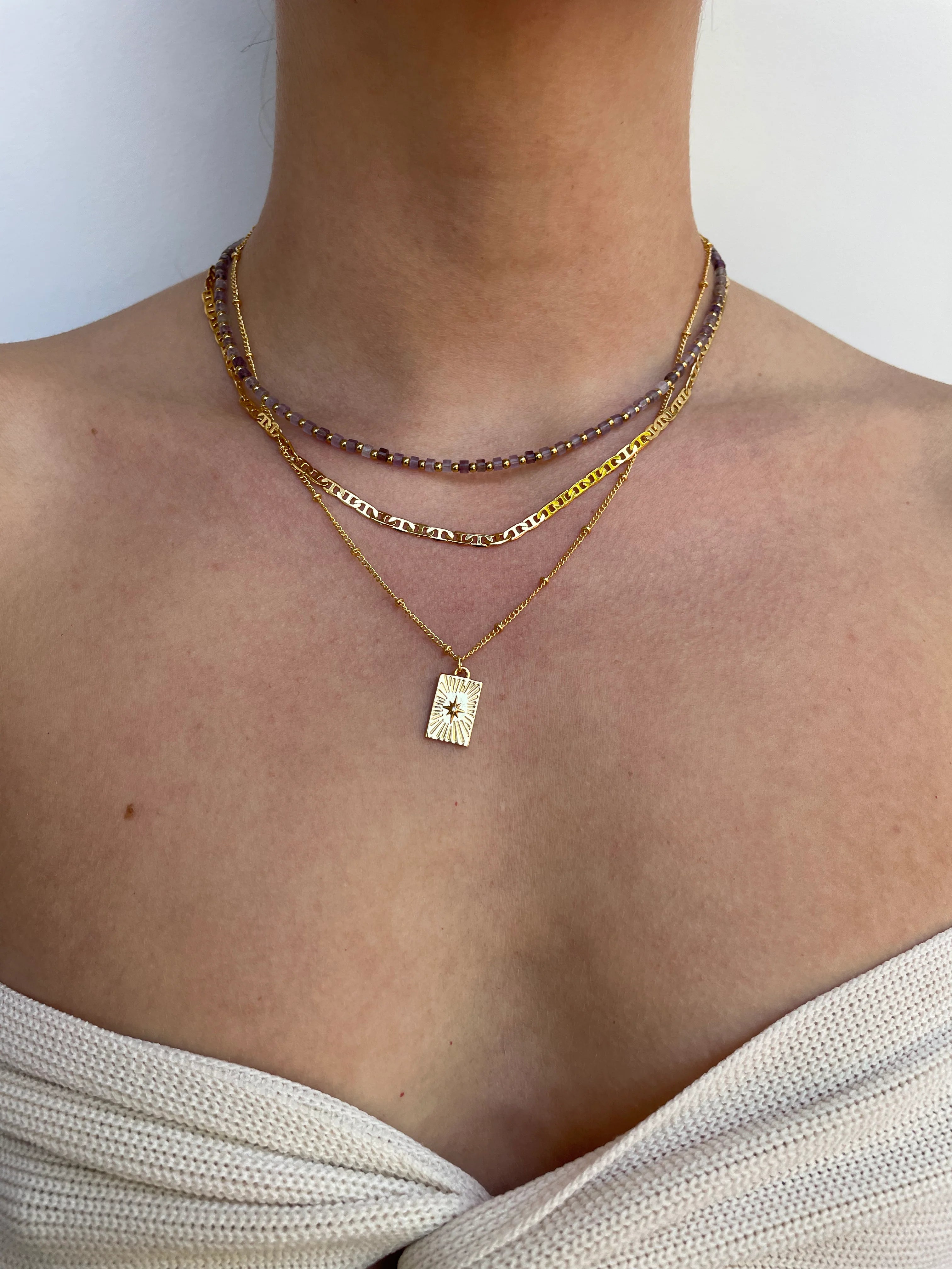 Introducing the Layla Necklace, a dainty and enchanting piece that adds a touch of celestial beauty to your jewellery collection. This necklace features a delicate chain that elegantly drapes around your neck, creating a subtle and feminine look. The highlight of the Layla Necklace is its square pendant, carefully engraved with a mesmerising star design. The intricate detailing of the stars brings a sense of magic and wonder to the necklace, making it a captivating accessory that captures attention. Crafted with precision and attention to detail, the pendant is made to shine and shimmer in the light, adding a subtle sparkle to your ensemble. The Layla Necklace is versatile and can be worn for both casual and formal occasions, effortlessly elevating your style. With its high-quality materials and meticulous craftsmanship, this necklace is built to last and withstand the test of time. Embrace the celestial allure of the Layla Necklace and let its elegant design and celestial charm inspire your inner radiance.