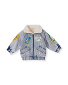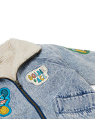Keep your little one cozy with this blue denim jacket from Goldie + Ace. Featuring a faux shearling lined body and hood, it offers extra warmth. The heavy weight corduroy and wadded sleeves add durability, while the zip-through front and functional pockets provide practicality. Illustrated signature patches add a unique touch.