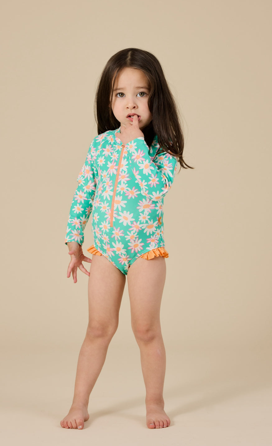Goldie + Ace - Daisy Patch Long Sleeve Frill Swimsuit (Moss)