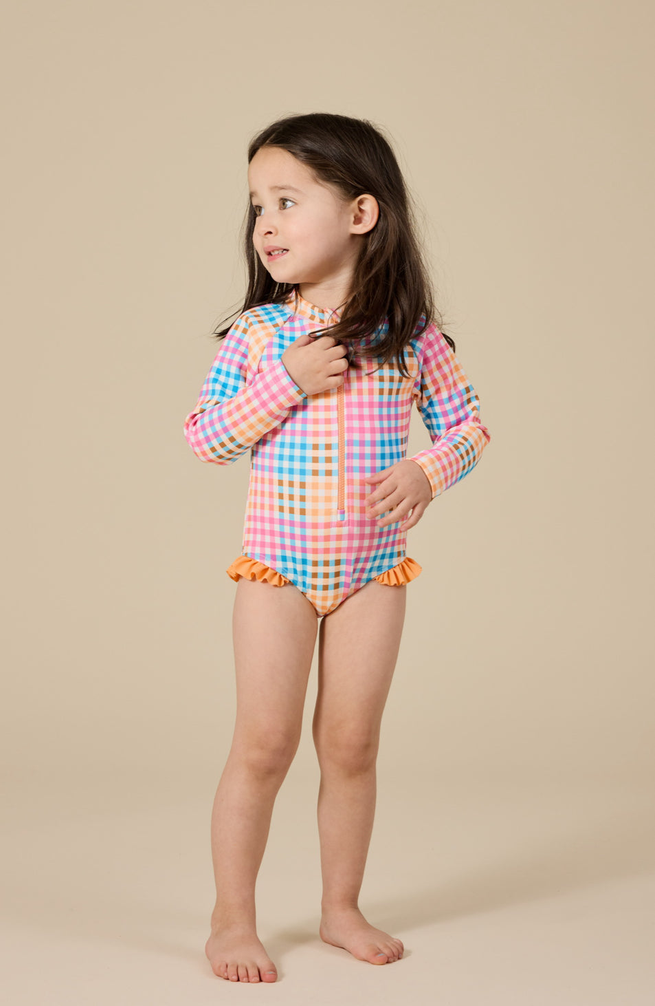 Goldie + Ace - Long Sleeve Frill Swimsuit (Rainbow Gingham)