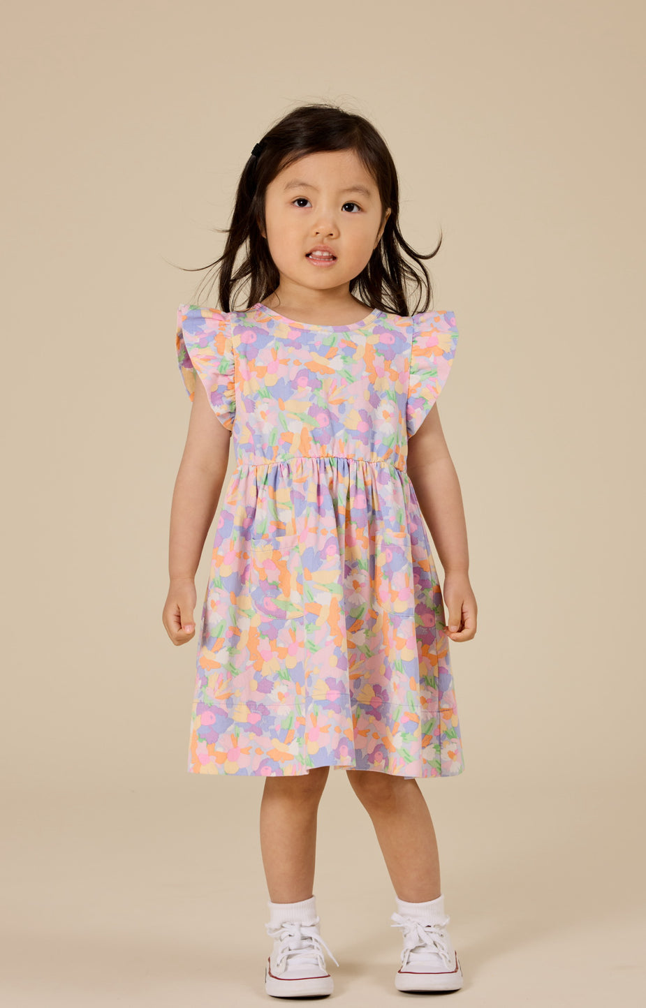 | True to size. Relaxed fit. Tie back opening for easy dressing. Elasticated at waist. Featuring frill sleeves, functional front pockets and a hand drawn abstract floral print. Perfect for twirling. |