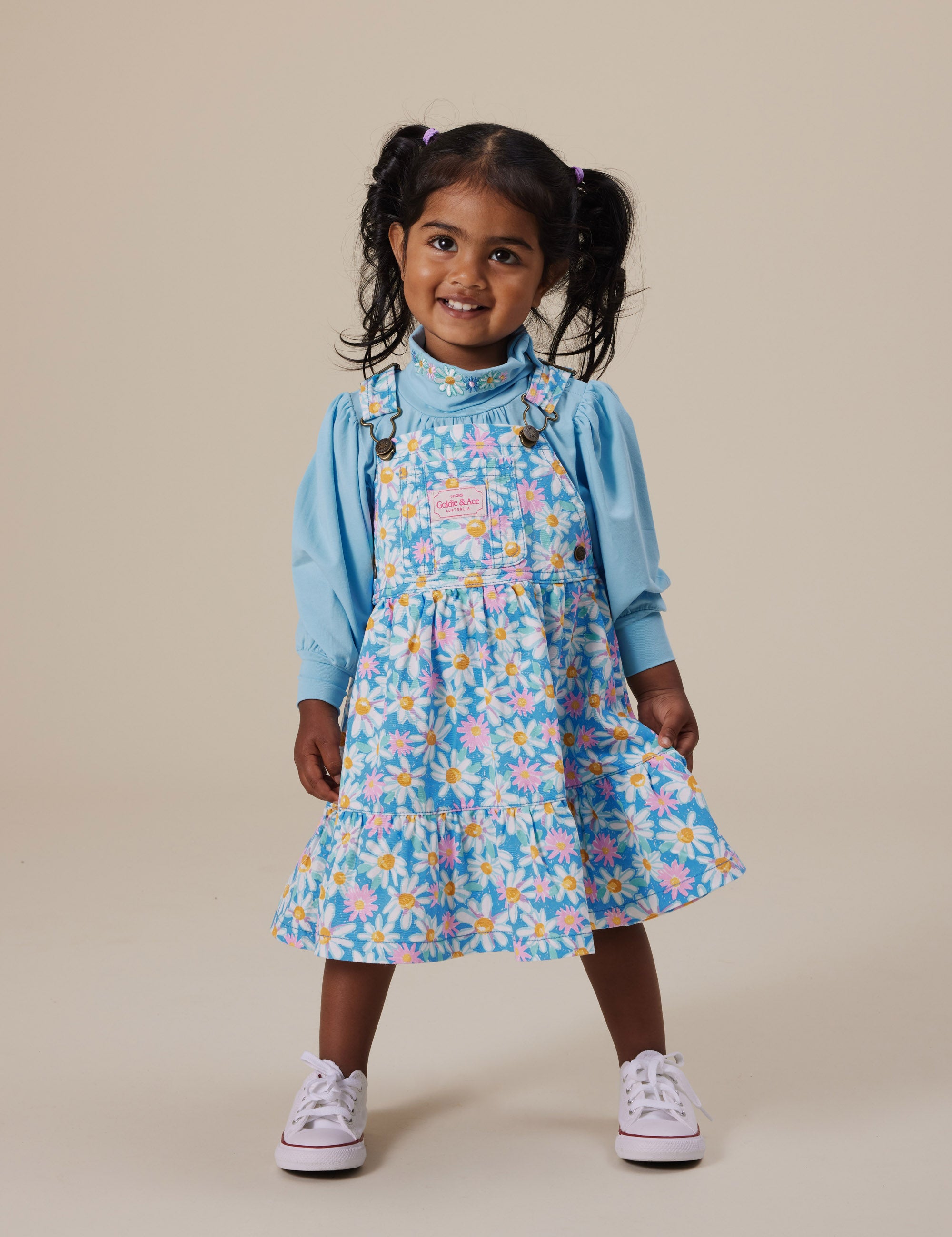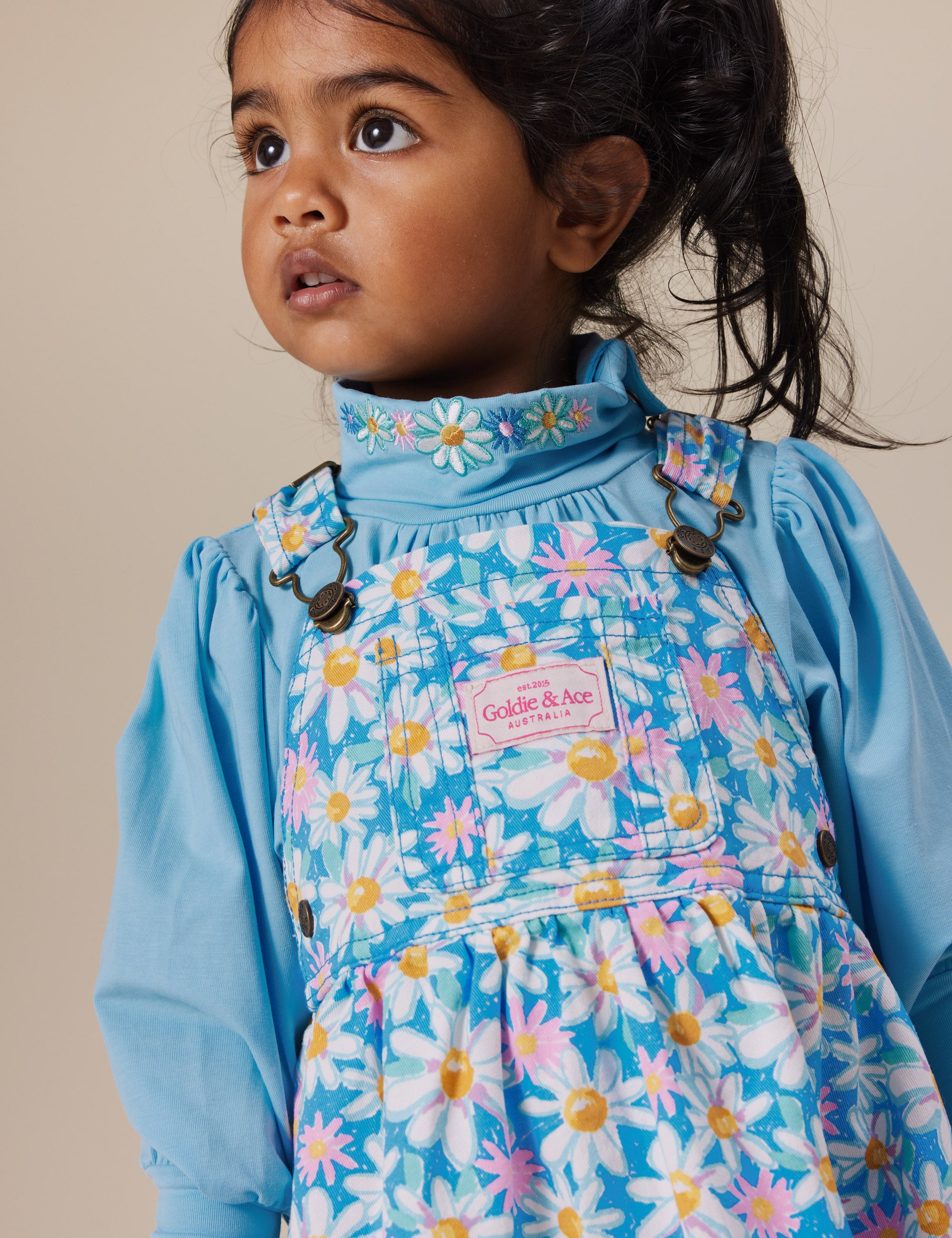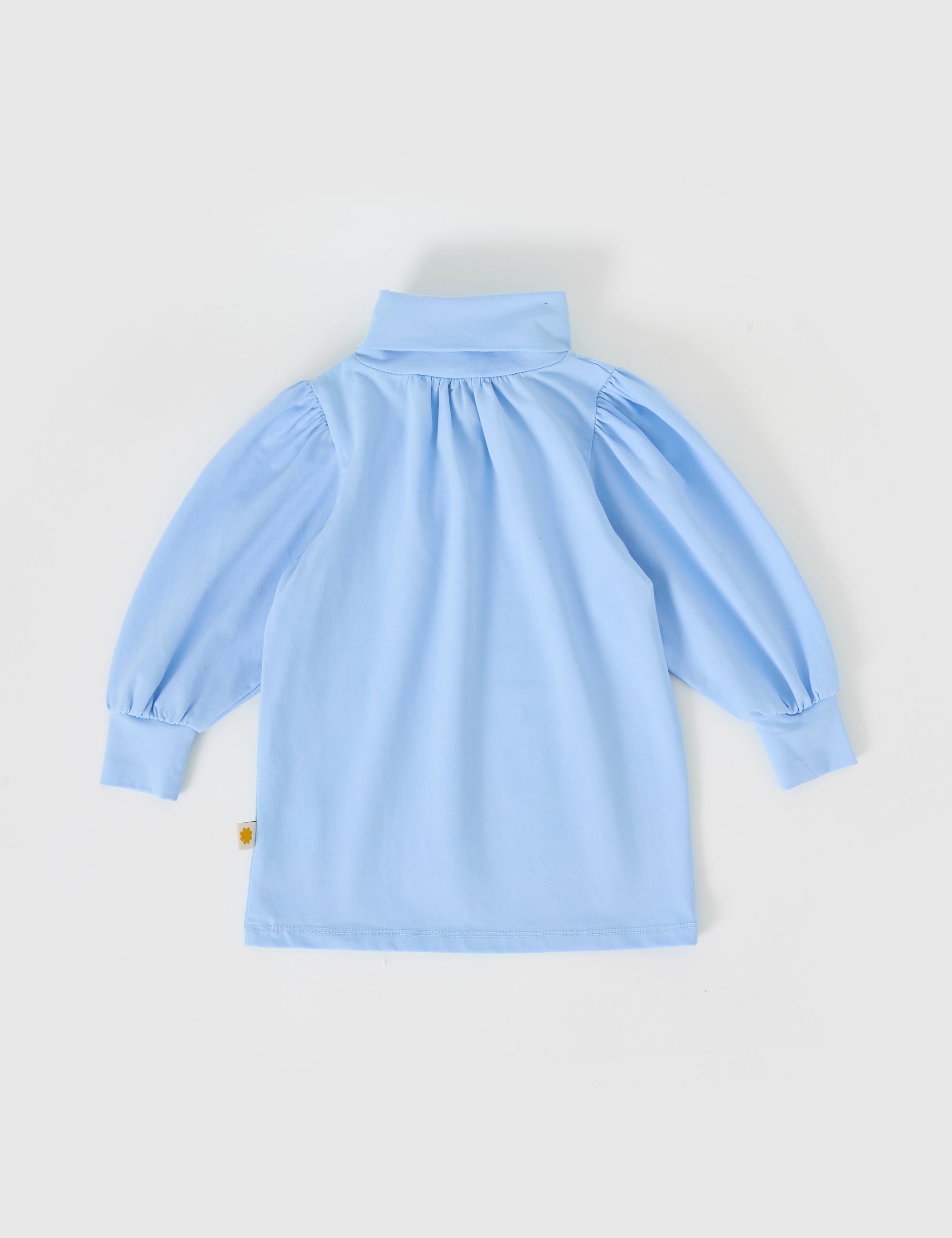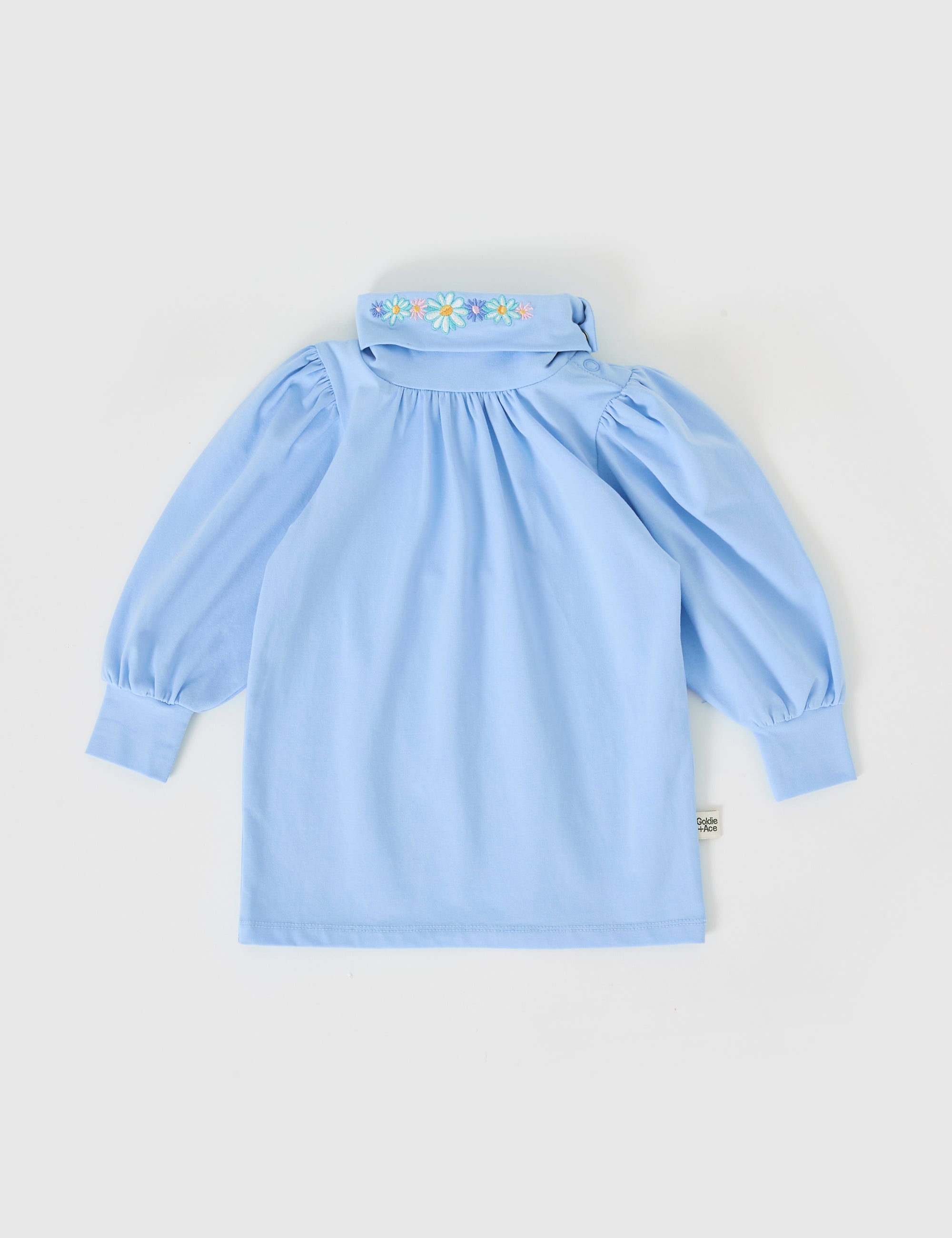 True to size. Cotton jersey fabrication provides good stretch and room to grow. Roll neck style to keep in the warmth, with a floral embroidery feature and puff sleeves