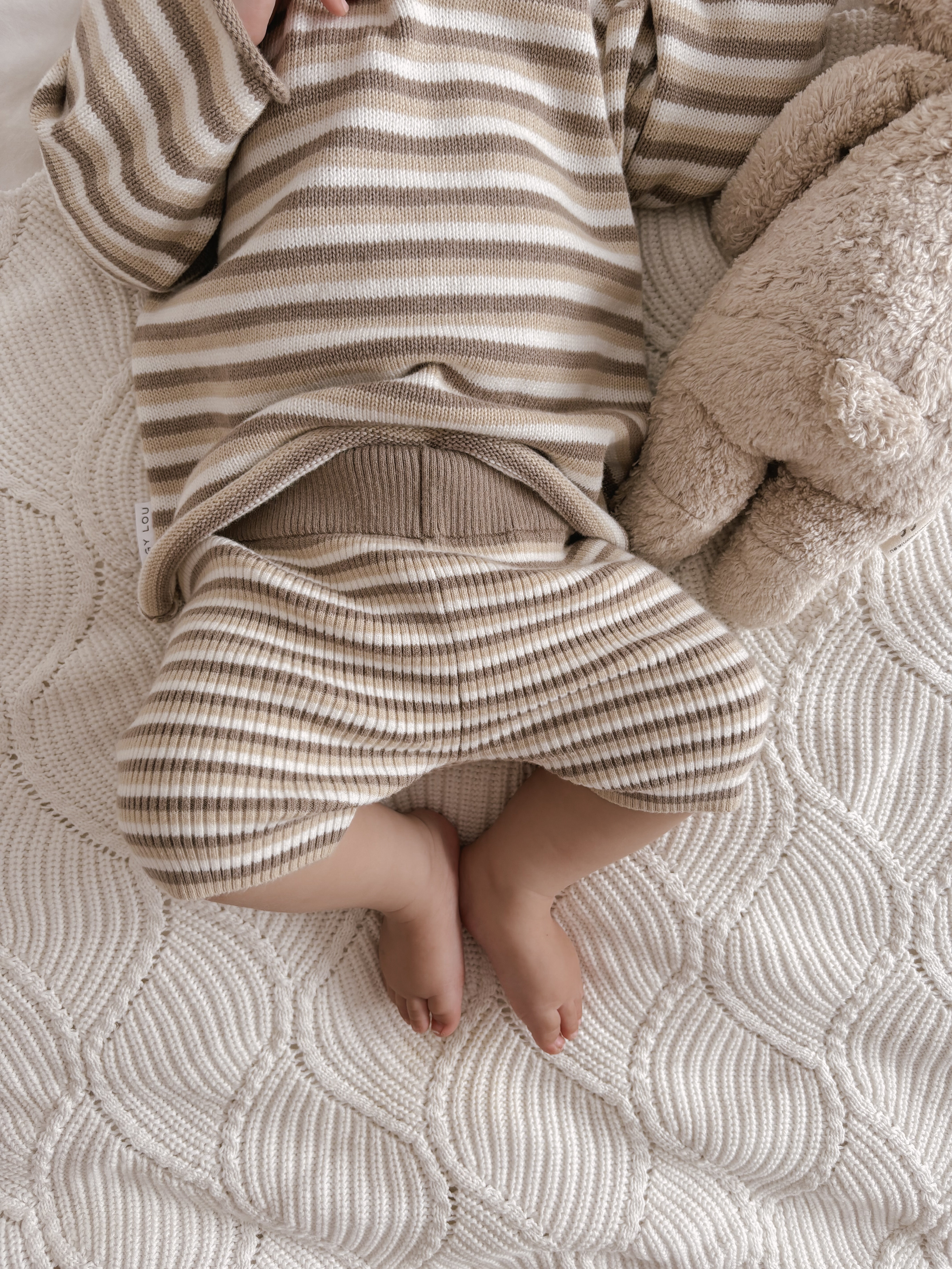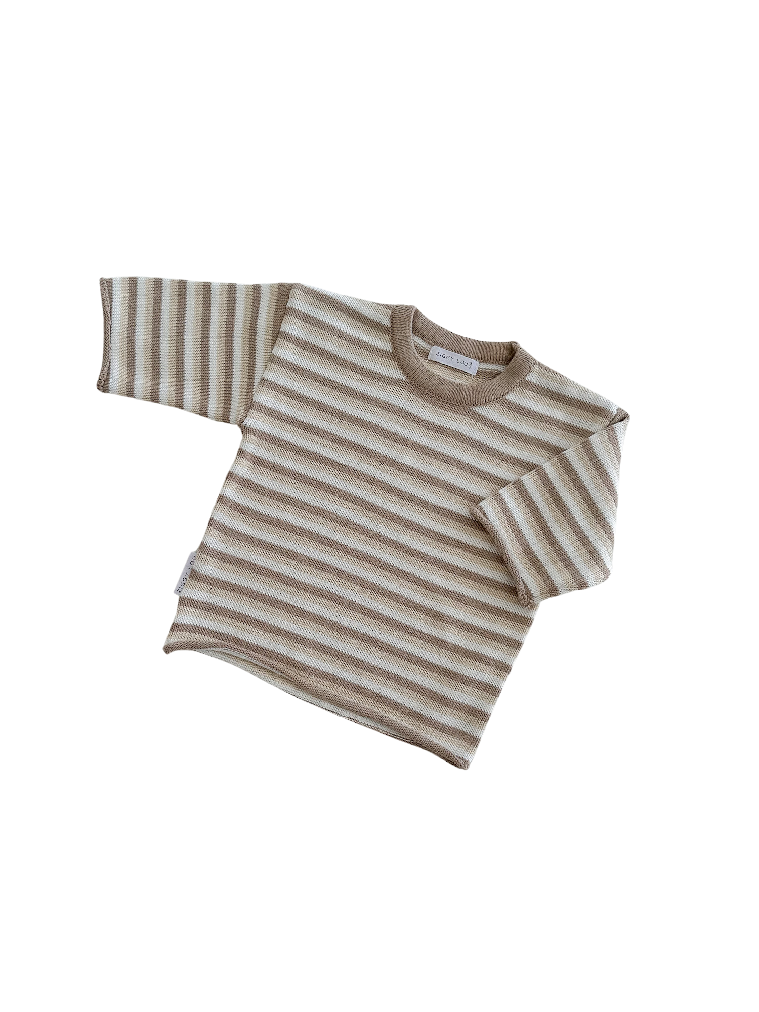 Our Cappuccino knitted pullover features Milo, Latte + Milk Stripes and a rolled hem. Mix and match with items from our Cappuccino, Sorrento + Milo Collections.