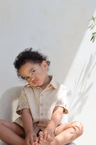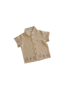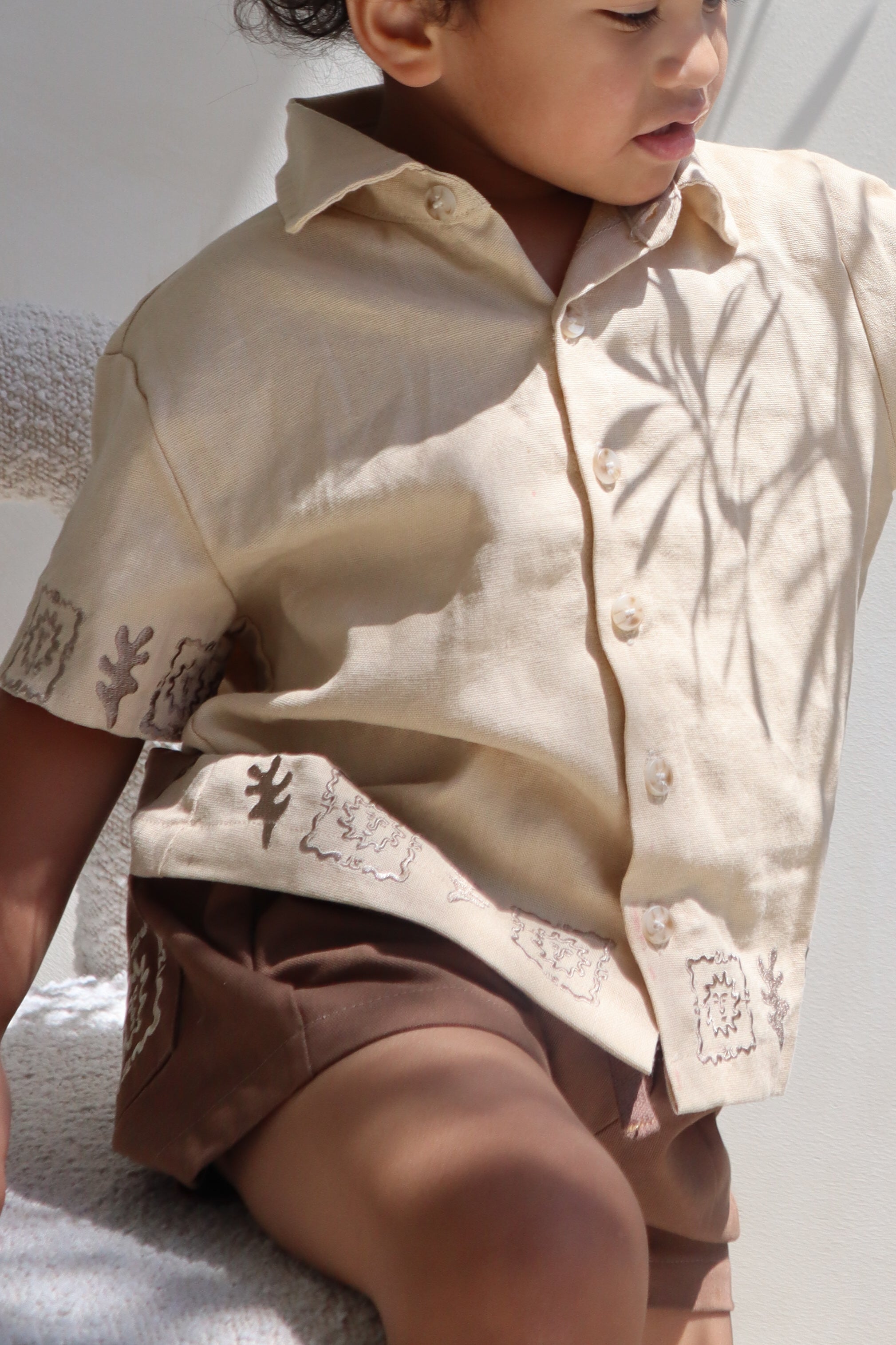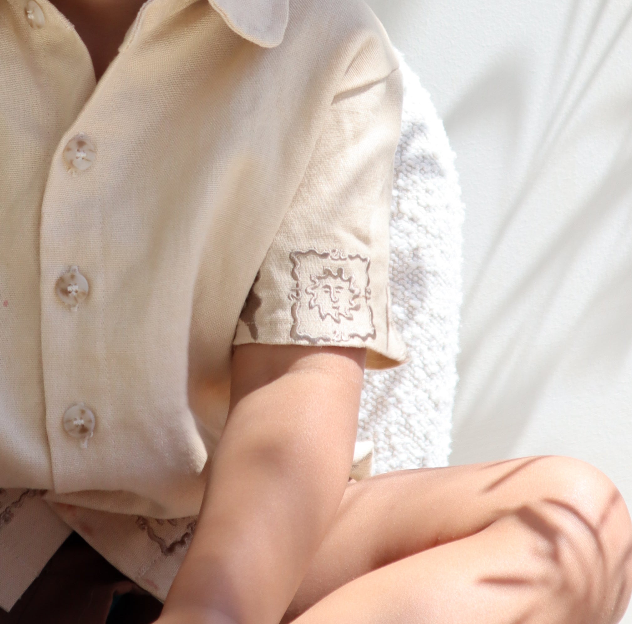 Linen blend collared shirt with our Sorrento embroidered design. Functional buttons down the front. Mix and match with our Sorrento, Milo + Cappuccino Summer Collection.