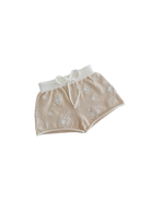 Latte knit shorts featuring our embroidered Gia design in milk, elastic waist + functional drawstring with rolled leg hem.
