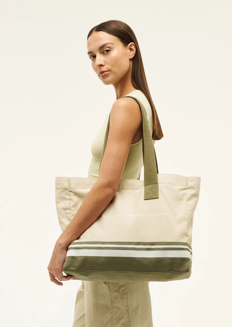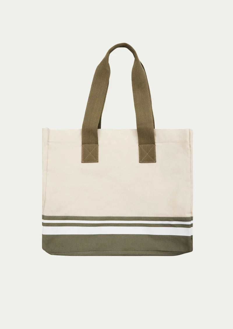 The Elsewhere Tote in Overcast comes as part of our REC CLUB Collection. This cotton canvas tote bag features a cotton shoulder strap, snap closure, a P.E Nation custom print and an internal pocket. Ideal for the beach, or carrying all your everyday essentials, wear this tote on-the-go all year long.