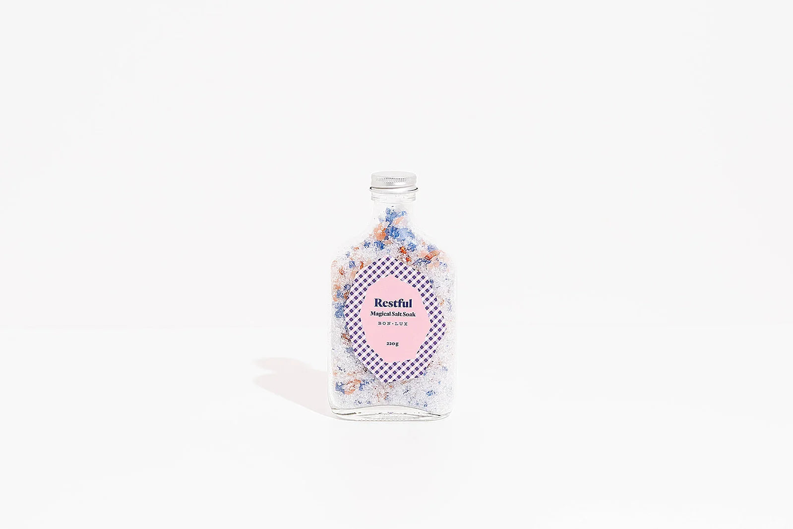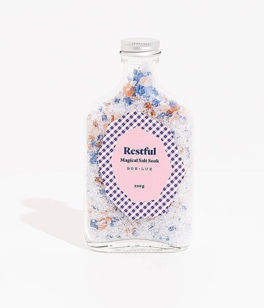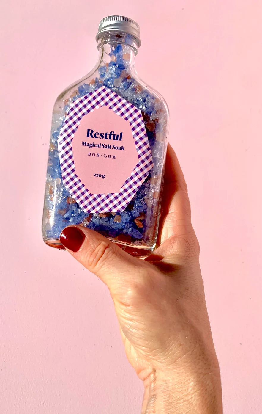 Restful bath salts with magical magnesium, salts and minerals, for soothing self-care. Rich in epsom salt, iron and zinc, scented with lavender, rose and citrus essential oils for relaxing bodies and minds.