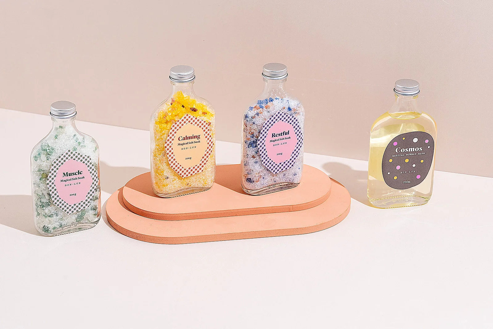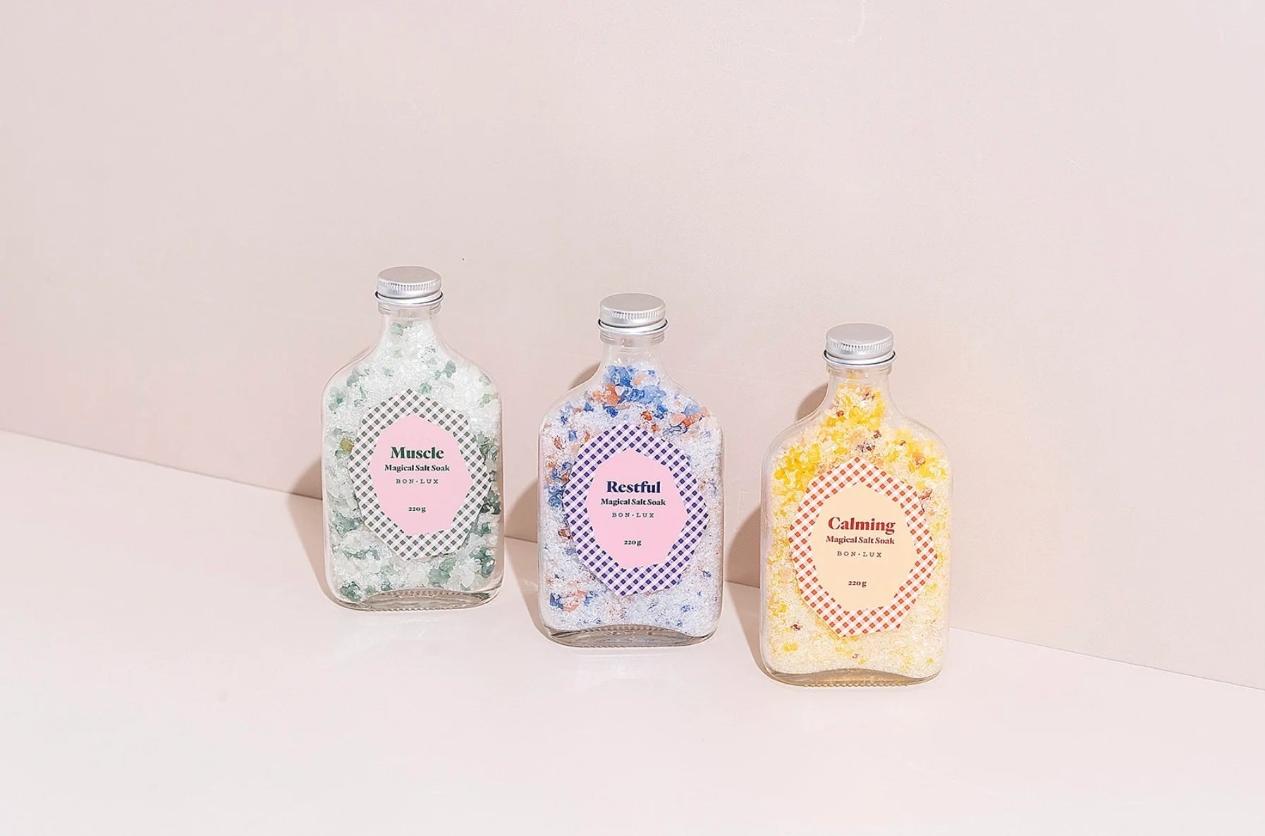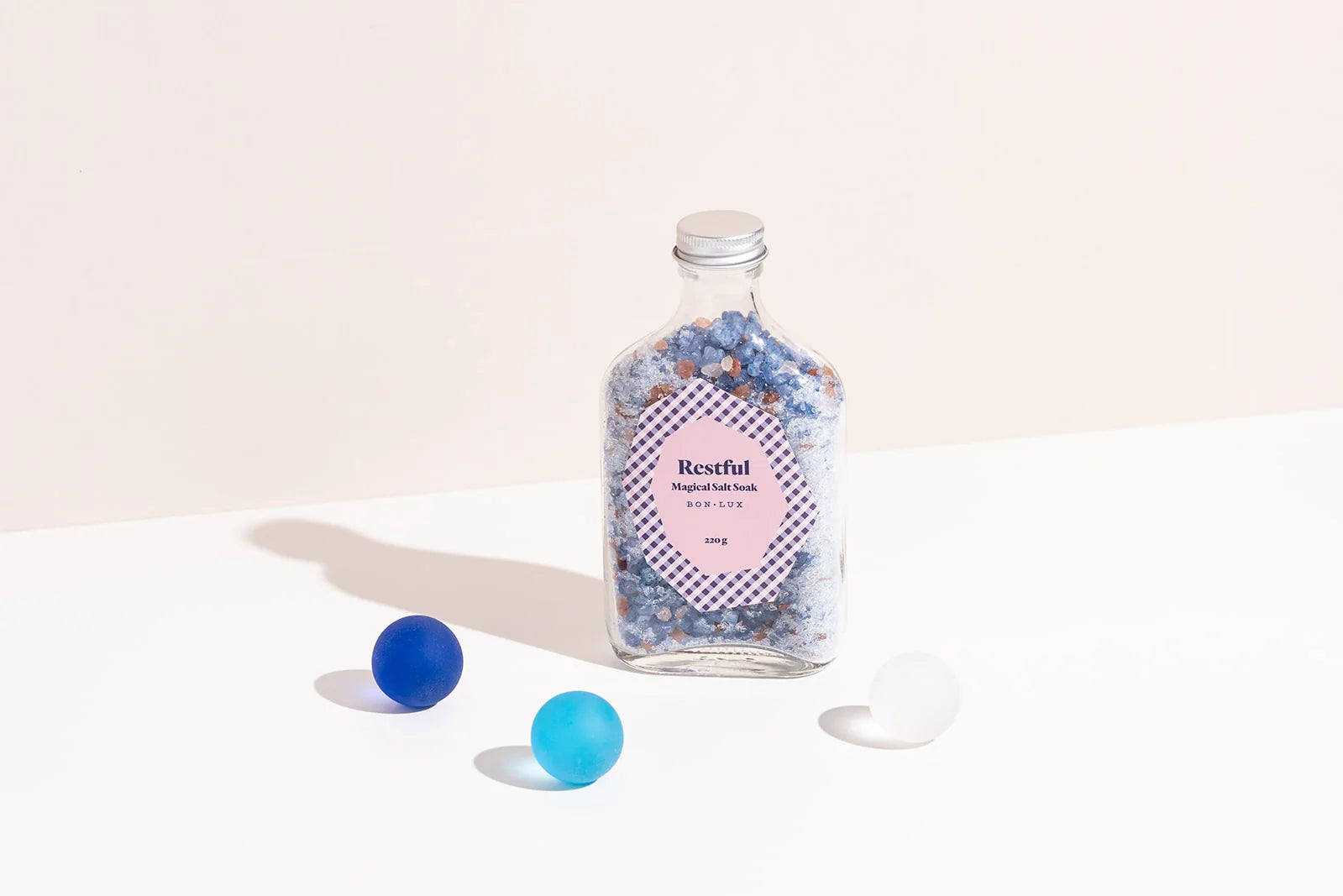 Restful bath salts with magical magnesium, salts and minerals, for soothing self-care. Rich in epsom salt, iron and zinc, scented with lavender, rose and citrus essential oils for relaxing bodies and minds.