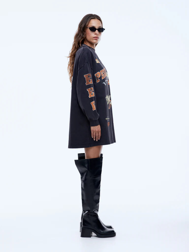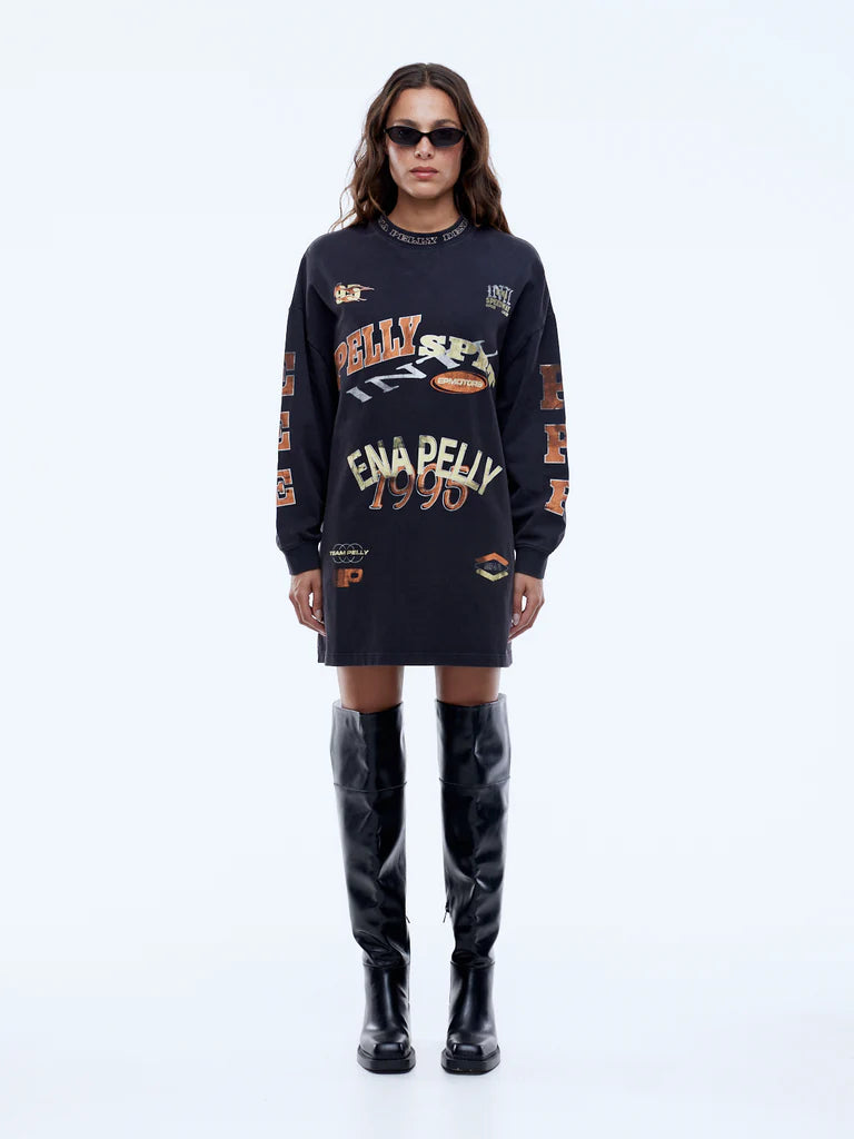 The Pelly Sport Tee Dress is cut from cotton jersey in washed black with an oversized long-sleeve silhouette. Designed to be worn as a mini dress, moto-inspired graphics and a vintage wash deliver bold, street-ready appeal.