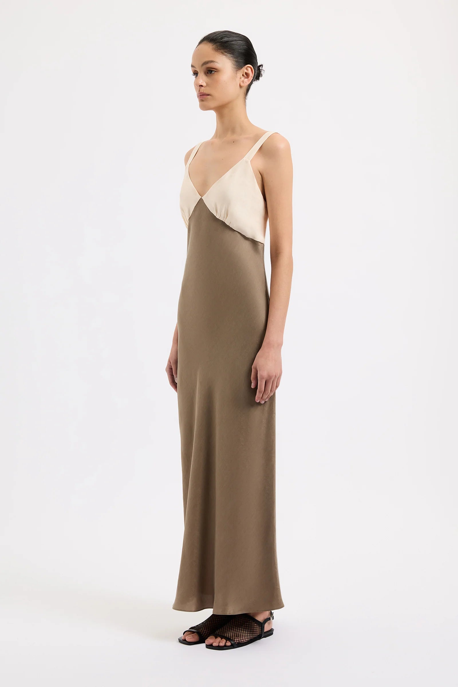 The Seshni Tencel Slip Dress is made from a Tencel blend fabrication with a soft, sueded hand feel. Cut on the bias, this silhouette drapes over the body softly and finishes ankle length. Features include contrast coloured bust panel, v neckline with a gathered under bust seam and thick adjustable shoulder straps.