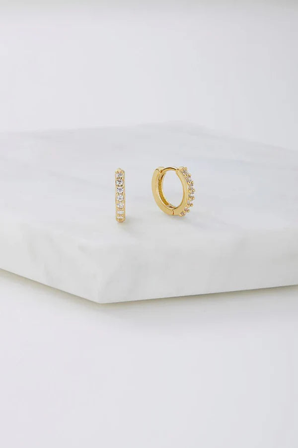 These small silver huggies are adorned with sparkling embedded crystals halfway around, offering a perfect blend of elegance and shine. A versatile piece that adds subtle luxury to any look, these hoops are ideal for both everyday wear and special occasions.