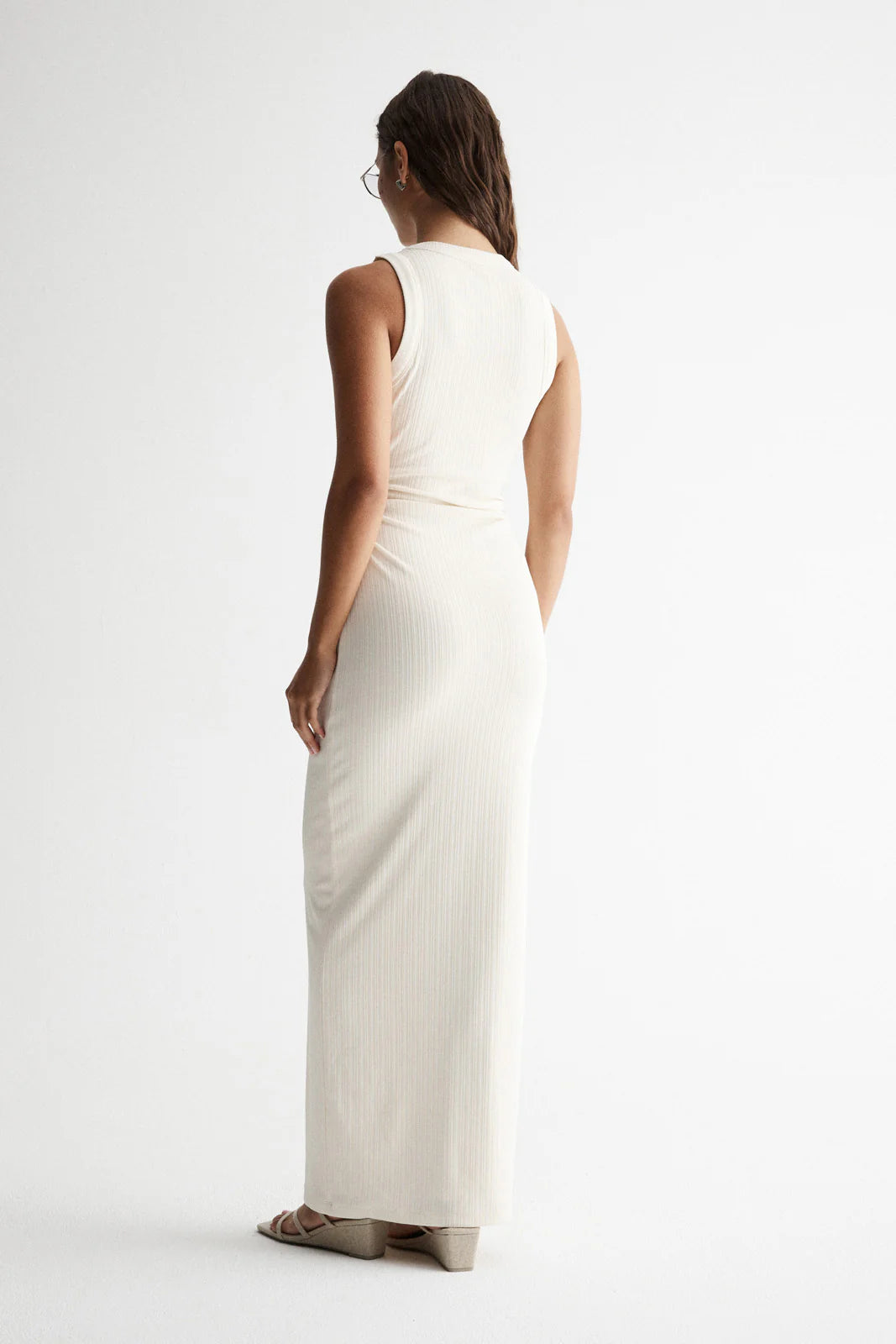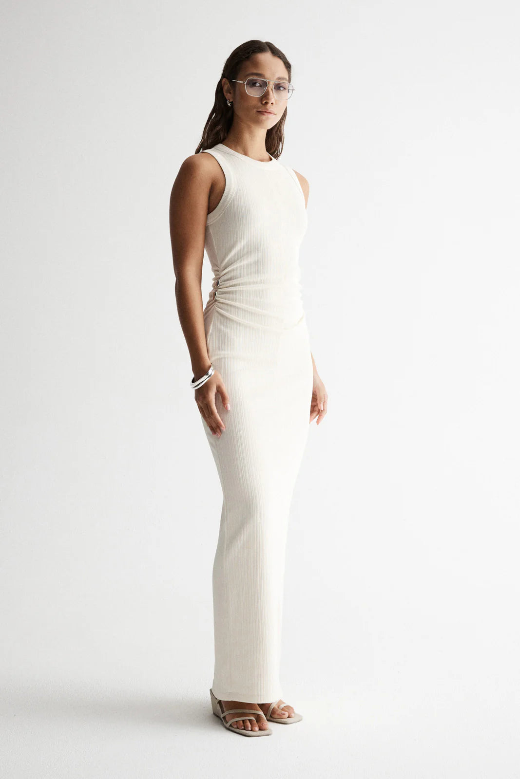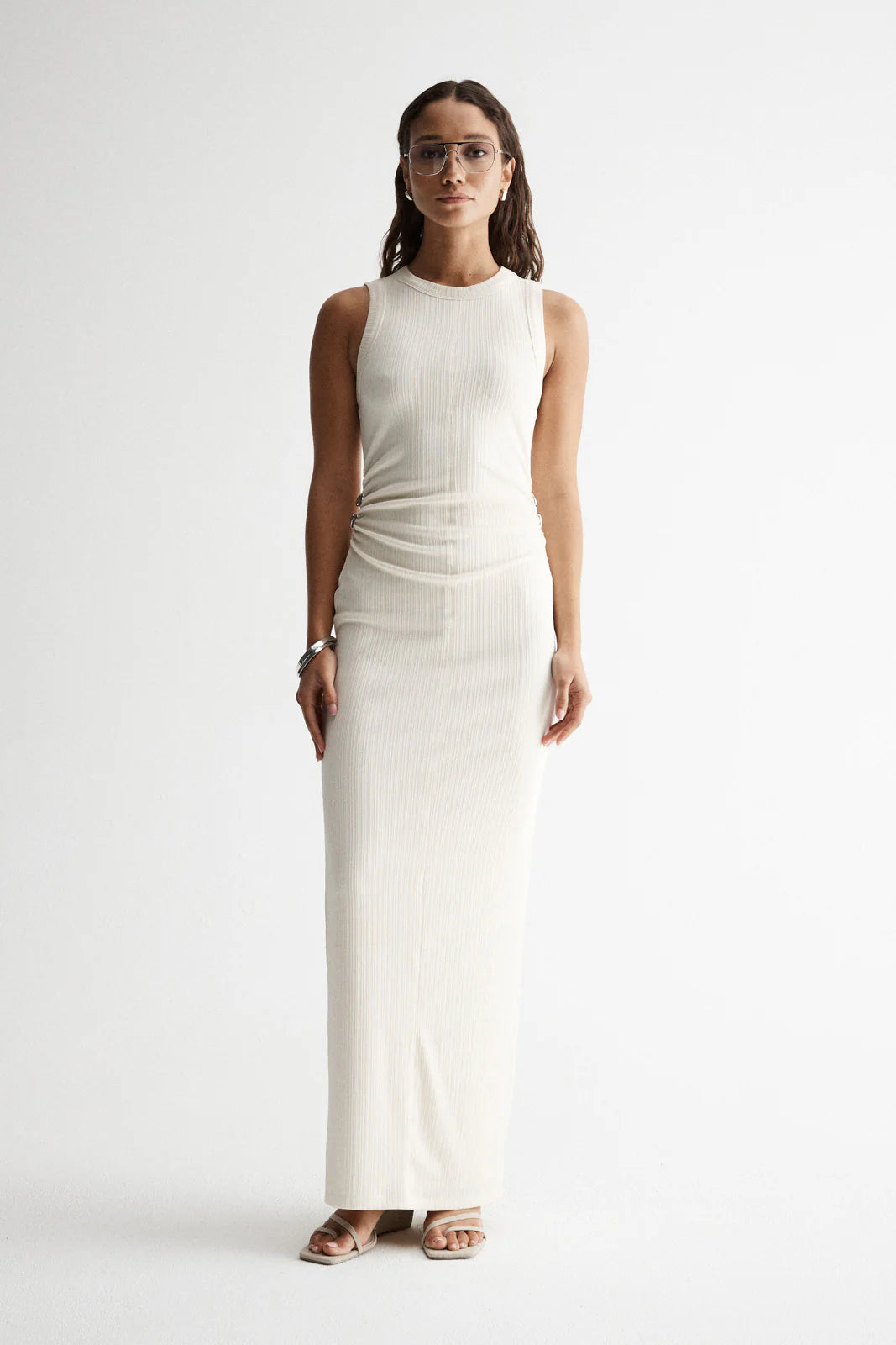 Understated yet exuding extreme elegance, the Acacia Dress combines simplistic design with statement accents to bring you an outfit made for wearing day to night, desk to dinner table. Made of a luxe jersey fabric, this dress is cut to a fitted silhouette that sticks firm to the figure with a crew neckline and chrome hardware detailing at the side seam. Soft gather detailing adds texture to the design. The Acacia Dress is fully lined for comfort and coverage. Style with metallic accessories and footwear.
