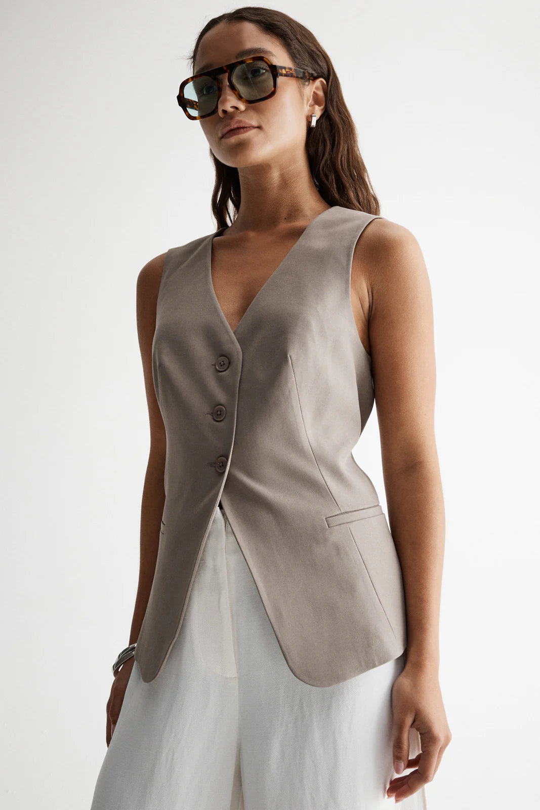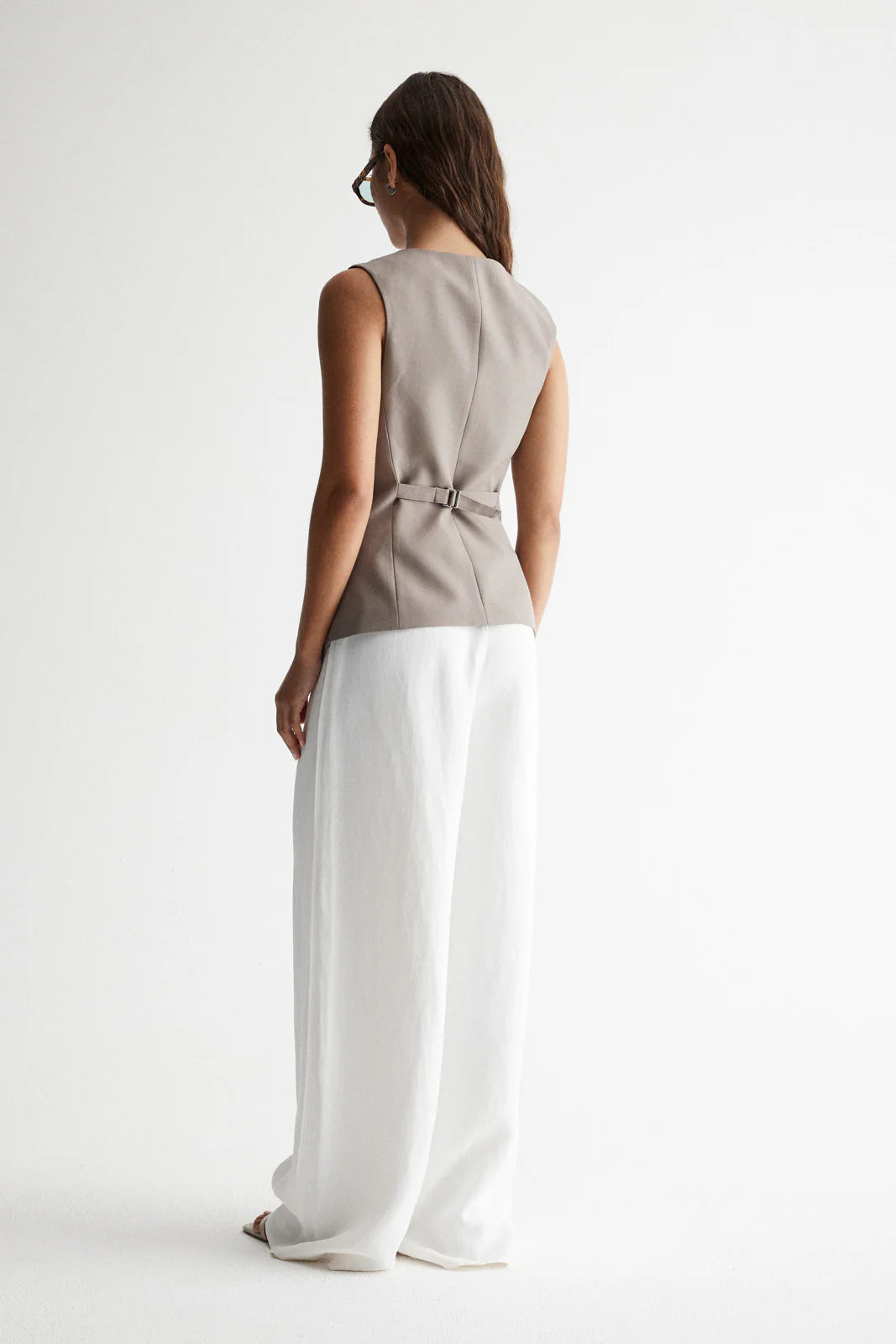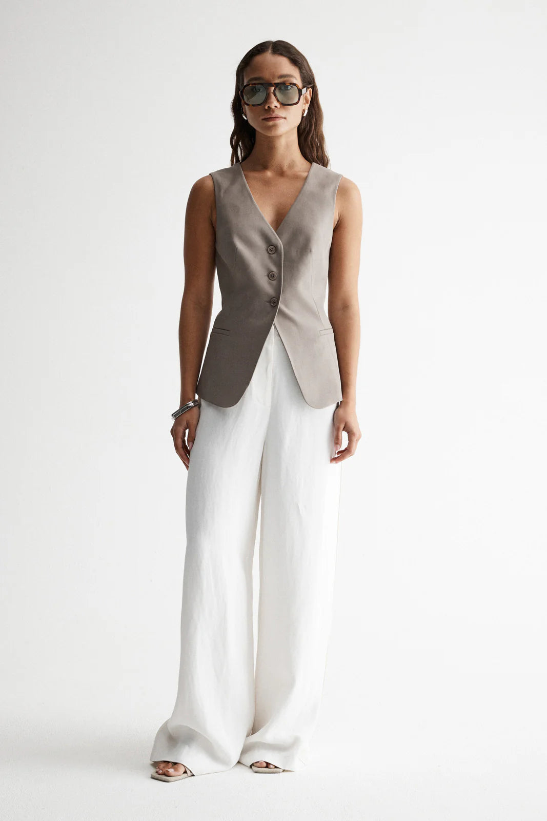 Sleek and versatile, a foundational piece like the Elowen Vest is essential for building a capsule wardrobe to carry you through the transitional seasons. Made of a luxuriously soft and smooth recycled fabric, the Elowen Vest drapes against the body for a flattering fit. Cut to a slim, tailored silhouette with button through front and back adjustment strap, this vest makes styling statement pieces and basics easy for morning to night outfitting.
