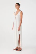 Relaxed and fluid, the Poppy Maxi Dress is designed with soft side slits and a plunging neckline that ties at the bust. Breathable and effortless, it’s ideal for warm days and light layering.