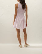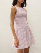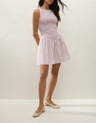 An everyday mini dress, designed from a signature 100% cotton, yarn-dyed in a nostalgic pink and red pinstripe. Sleeveless with a boat-style neckline, the bodice is shirred with a curved, gathered waist. It then falls into a soft A-line skirt that crops short on the body. With lightweight throw-on throw-off appeal, pack for your next summer vacation.
