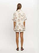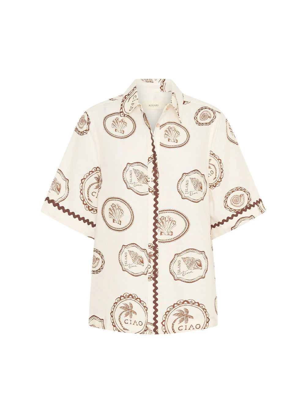 Ciao is hand sketched shells and coastal inspired stamps on a soft ivory base. The Ciao Shirt is a relaxed silhouette featuring a button down front, side splits, complete with contrast detailing.
