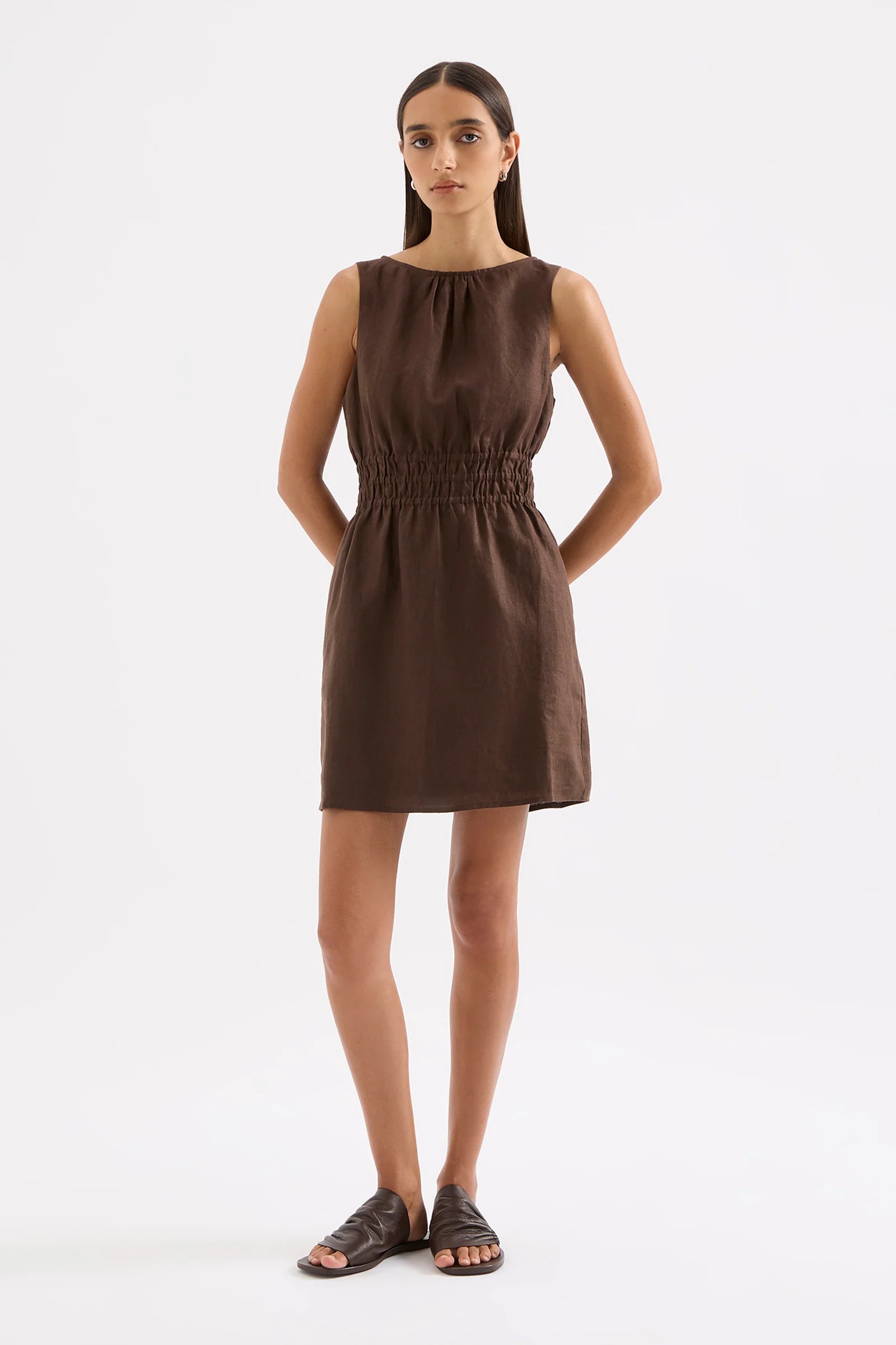 The Andri Linen Mini Dress is made from premium linen fabrication with a breathable, soft hand feel. This mini dress features a high boat neckline, shirred elastic waist, side seam pockets, invisible zipper at back and gathers at front neck.