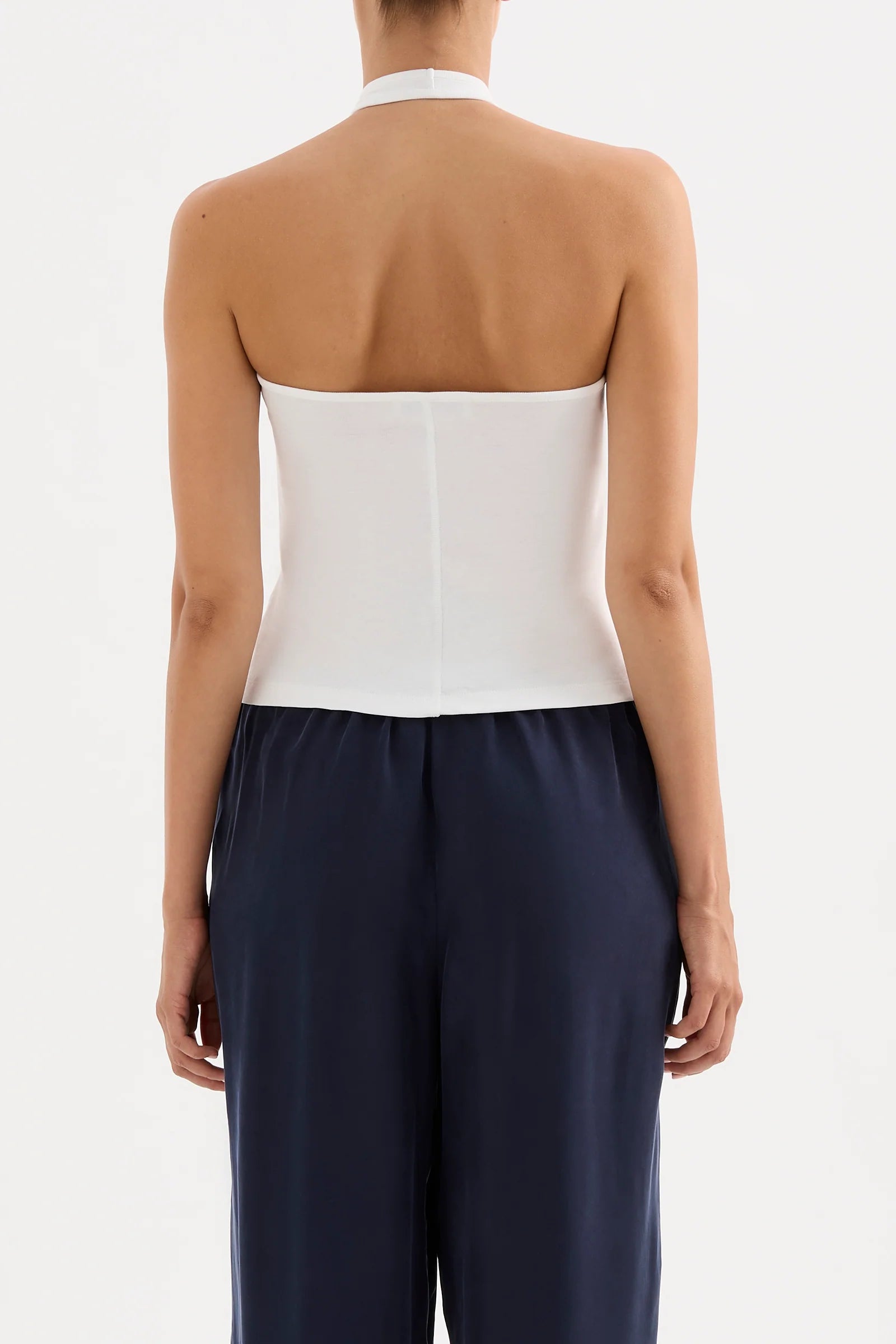 The Gaia Tank is made from a lightweight organic cotton jersey, which has a soft, breathable hand feel. The silhouette is a classic slim fitting tank finishing on the hips. Features include a thick halter neck and low scoop neckline.