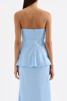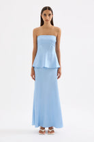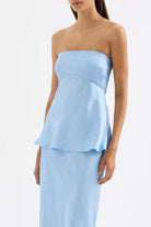 The Pandora Strapless top is made from a premium crushed satin featuring a luminous, gloss finish and subtle texture. The silhouette is strapless with a fitted bust and relaxed body finishing below hip with a softly fluted hemline. Features include an shaped empire waist line, gripper tape on inside neckline and invisible zipper opening.