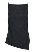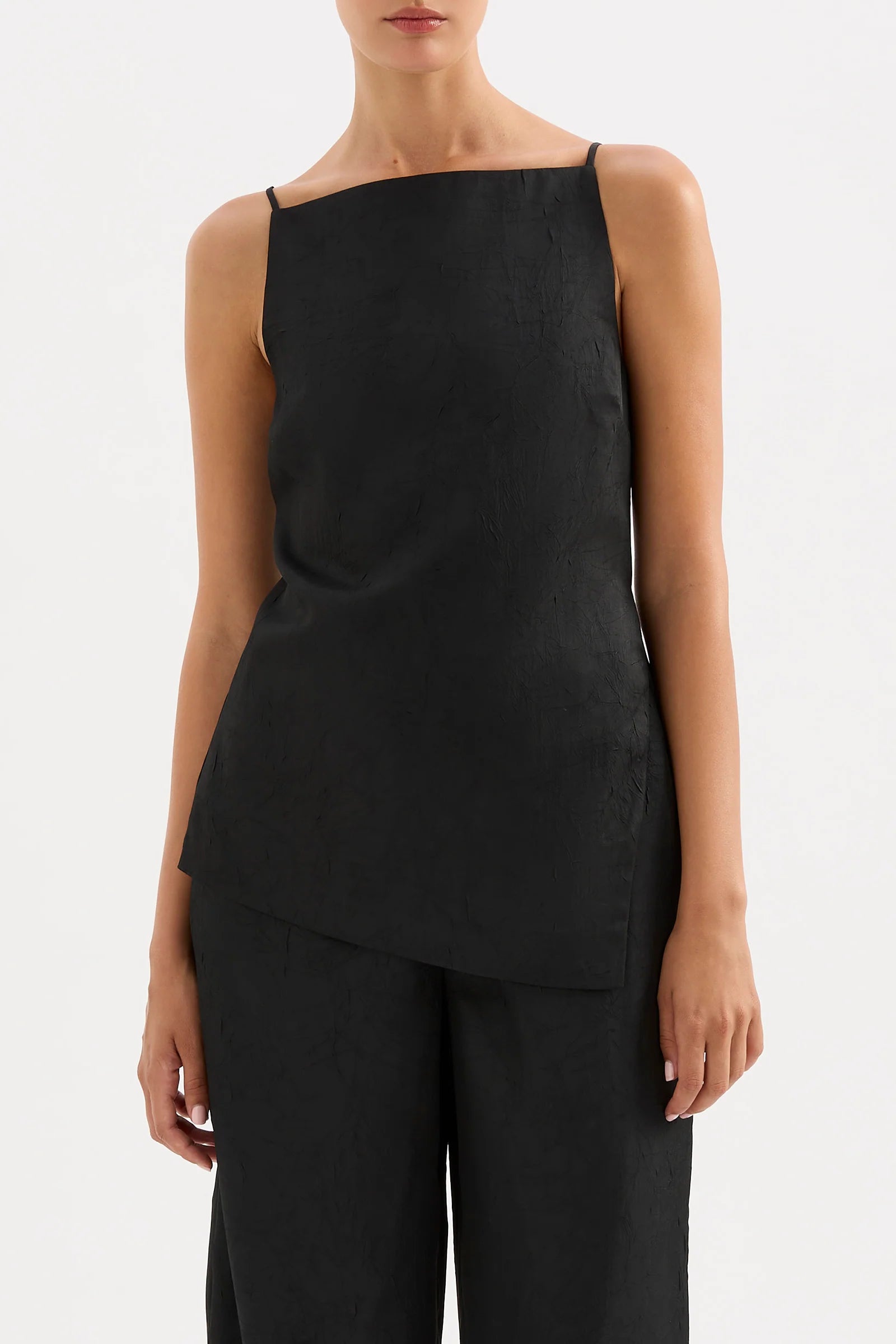 The Pandora Top is made from a premium crushed satin featuring a luminous, gloss finish and subtle texture. The silhouette has a sophisticated boat neckline with a cut out at side and an asymmetric hemline.