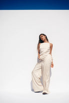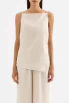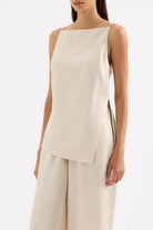 The Pandora Top is made from a premium crushed satin featuring a luminous, gloss finish and subtle texture. The silhouette has a sophisticated boat neckline with a cut out at side and an asymmetric hemline.