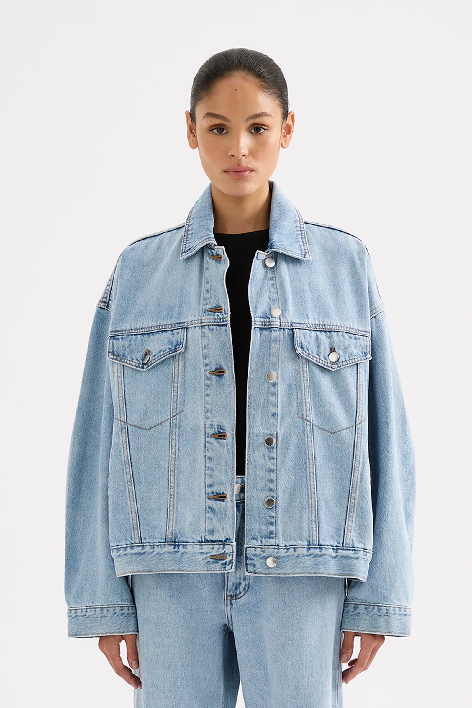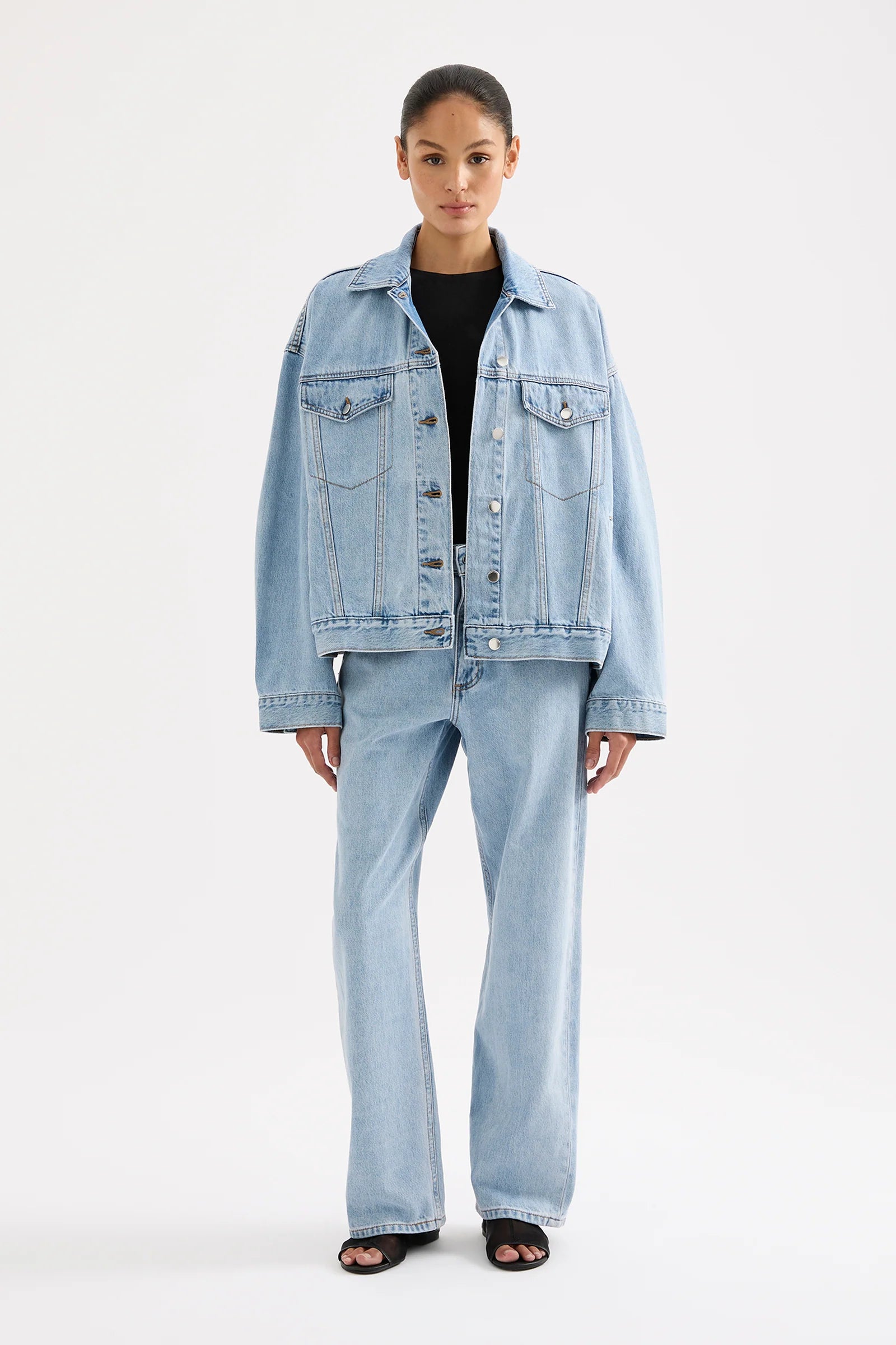 The Sia Denim Jacket is made from our 12 oz 100% organic cotton denim with a 90s Blue stone wash. The silhouette is oversized with a drop shoulder and length finishing at the hips. Features include front chest pockets, side welt pockets, panel detailing & branded shank button through centre and sleeve cuff.