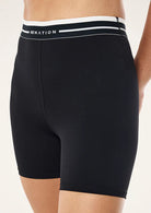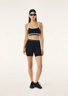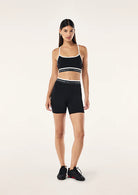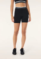The Avant 5" Bike Short in Black & Whisper White is made from our Studio Soft fabrication, a lightly peached fabric with a matte finish. This high rise 5" bike short features a branded elastic waistband and is ideal for Pilates or Yoga. Style this bike short with the Advantage Sports Bra to complete the set.