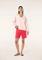 The Courtside v-neck Sweat in Petal is crafted from a soft, organic loop-back cotton. This relaxed fit sweat features a subtle contrast tipping on the cuff and is a P.E Nation must have. Featuring a P.E Nation logo at centre left, it’s perfect for lounging, so match it with the Man Down Short, or Pant for an easy elevated aesthetic. .