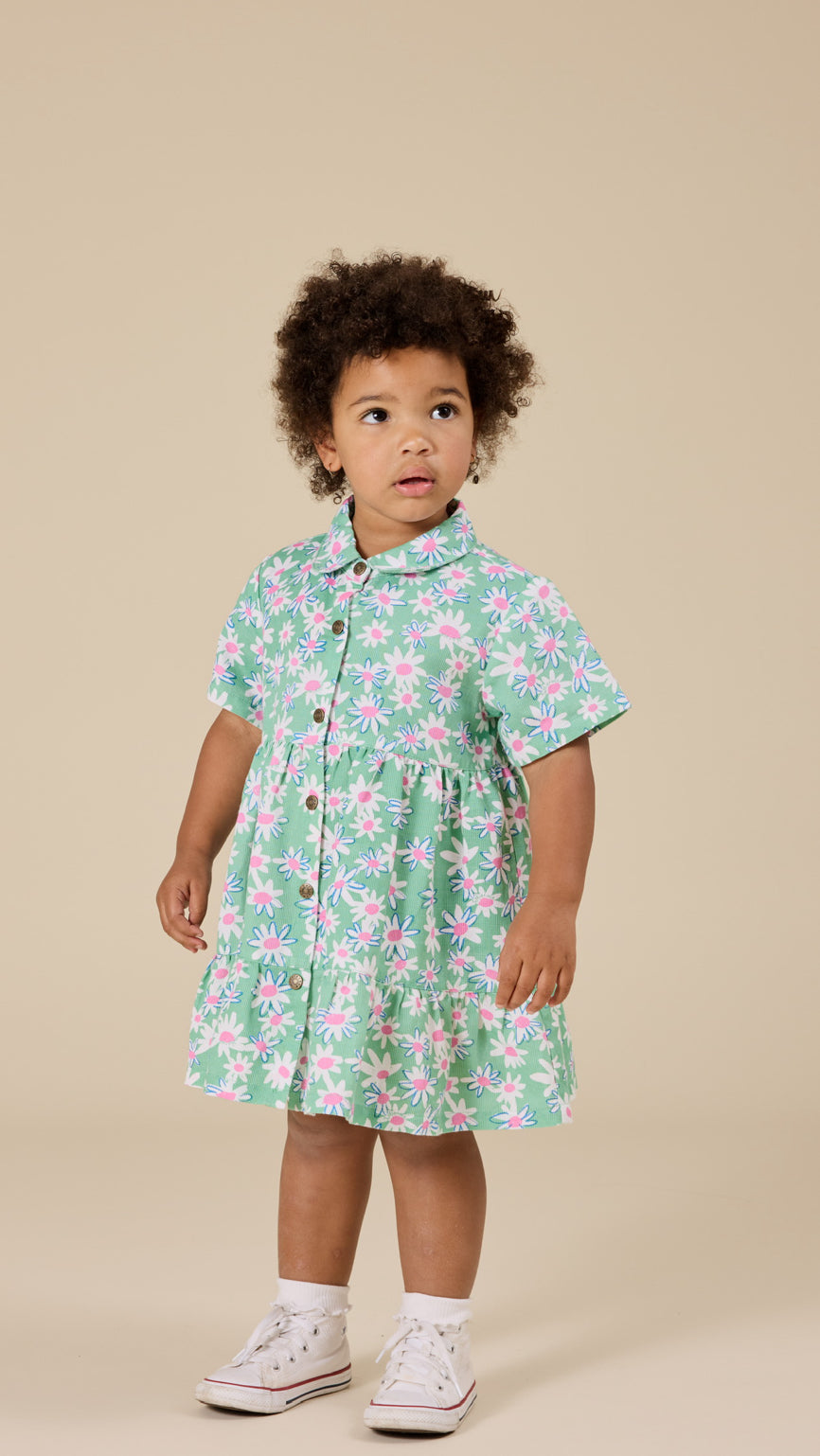 | True to size. Relaxed fit. Tiered, button down collared dress. Hand drawn daisy print. |