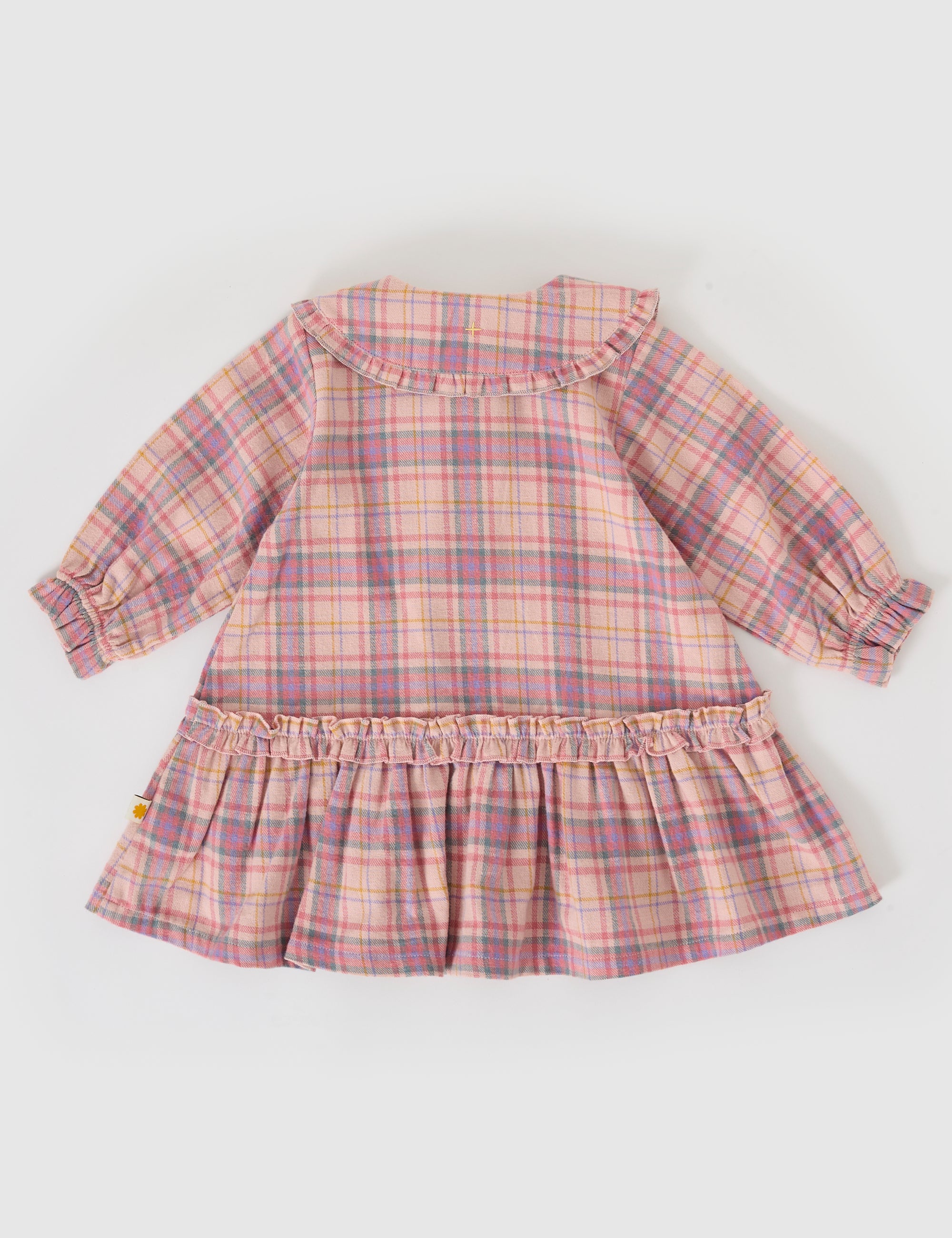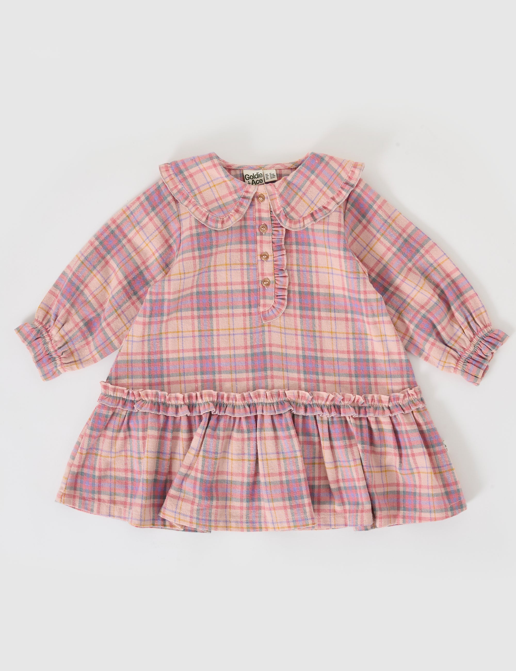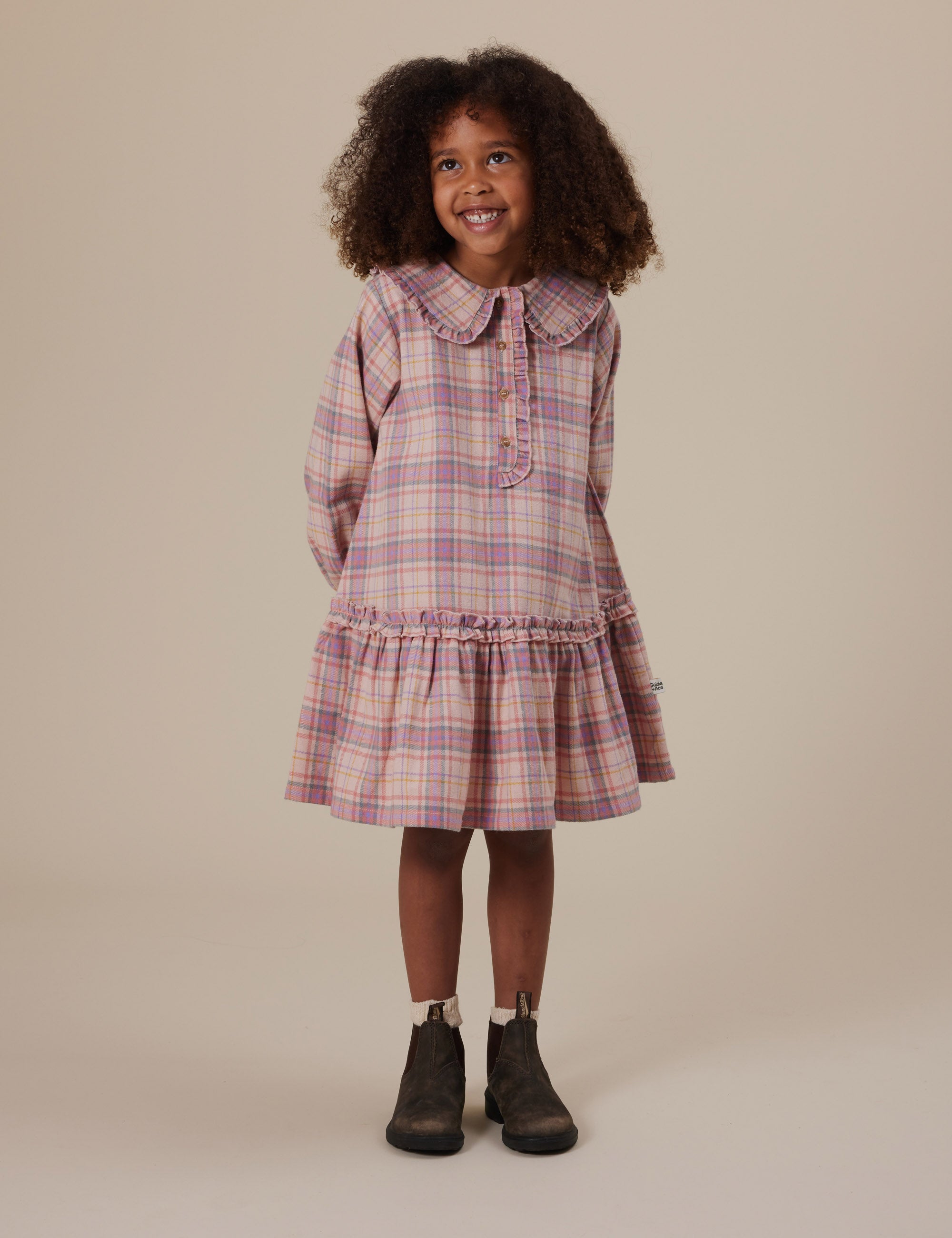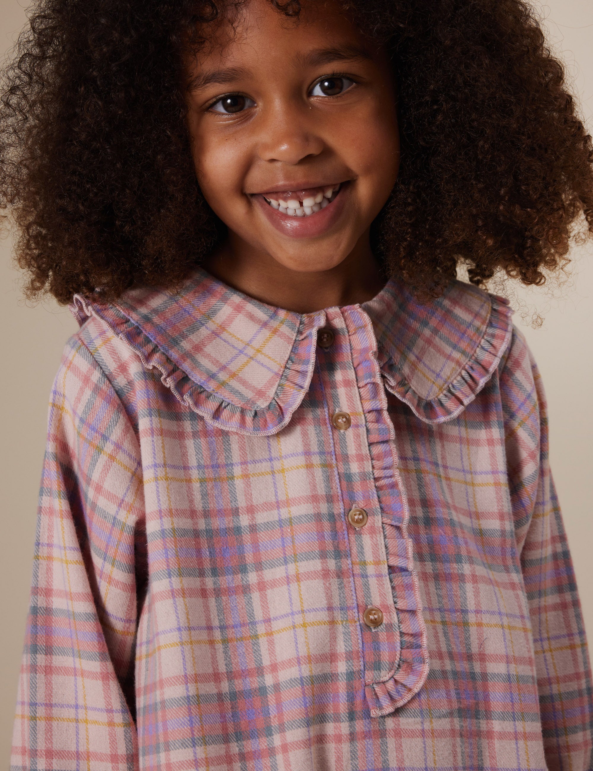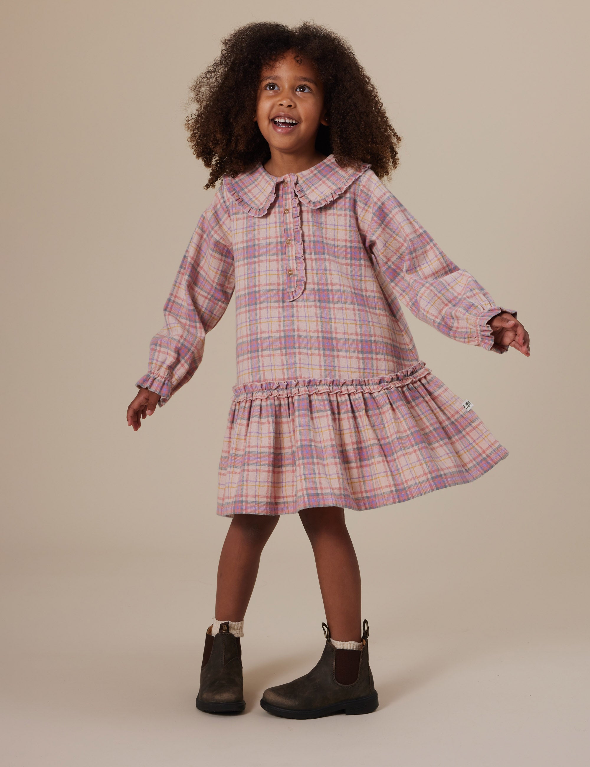 True to size. Relaxed fit. Soft, brushed cotton long sleeve dress featuring a drop hem frill, oversized collar and elasticated cuffs. Super cosy for winter layering.