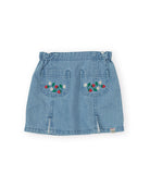Discover the Wild Strawberry Chambray Skirt in vintage blue from Goldie + Ace. This mid-weight denim piece features a soft wash, charming embroidery, and an adjustable waist for a comfortable fit. Functional pockets add practicality, and the skirt sits above the knee.