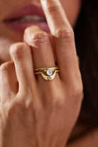 Our Baby Gold Crescent bands are one of our smallest stacking crescents, designed perfectly to hug our Nyra bands. The band is set with a delicate small moonstone at it's crown.