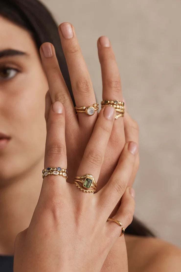 With a bezel-set baguette Apatite shining front and centre, framed by delicate linework on either side, it’s a band that stands beautifully on its own - but thrives in the company of a good stack.