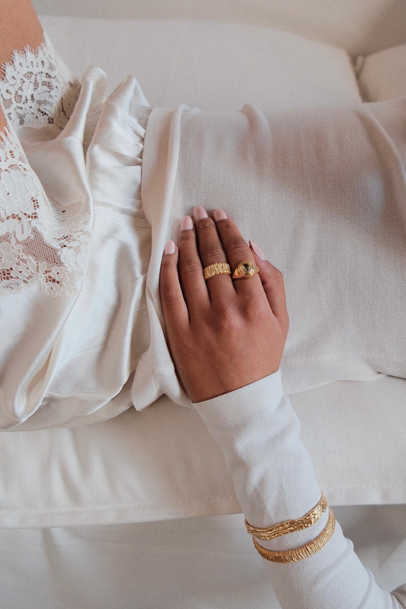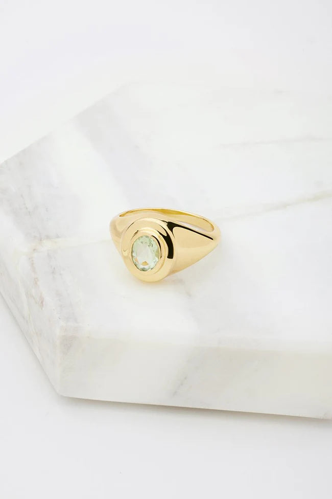 The Alex Ring is a modern classic, designed with a bold yet refined silhouette. Featuring a natural Green Amethyst at its centre, this statement ring brings a fresh pop of soft green against polished gold. Its clean, elevated design makes it the perfect piece to wear solo or to pair with other favourites for a layered, contemporary look.