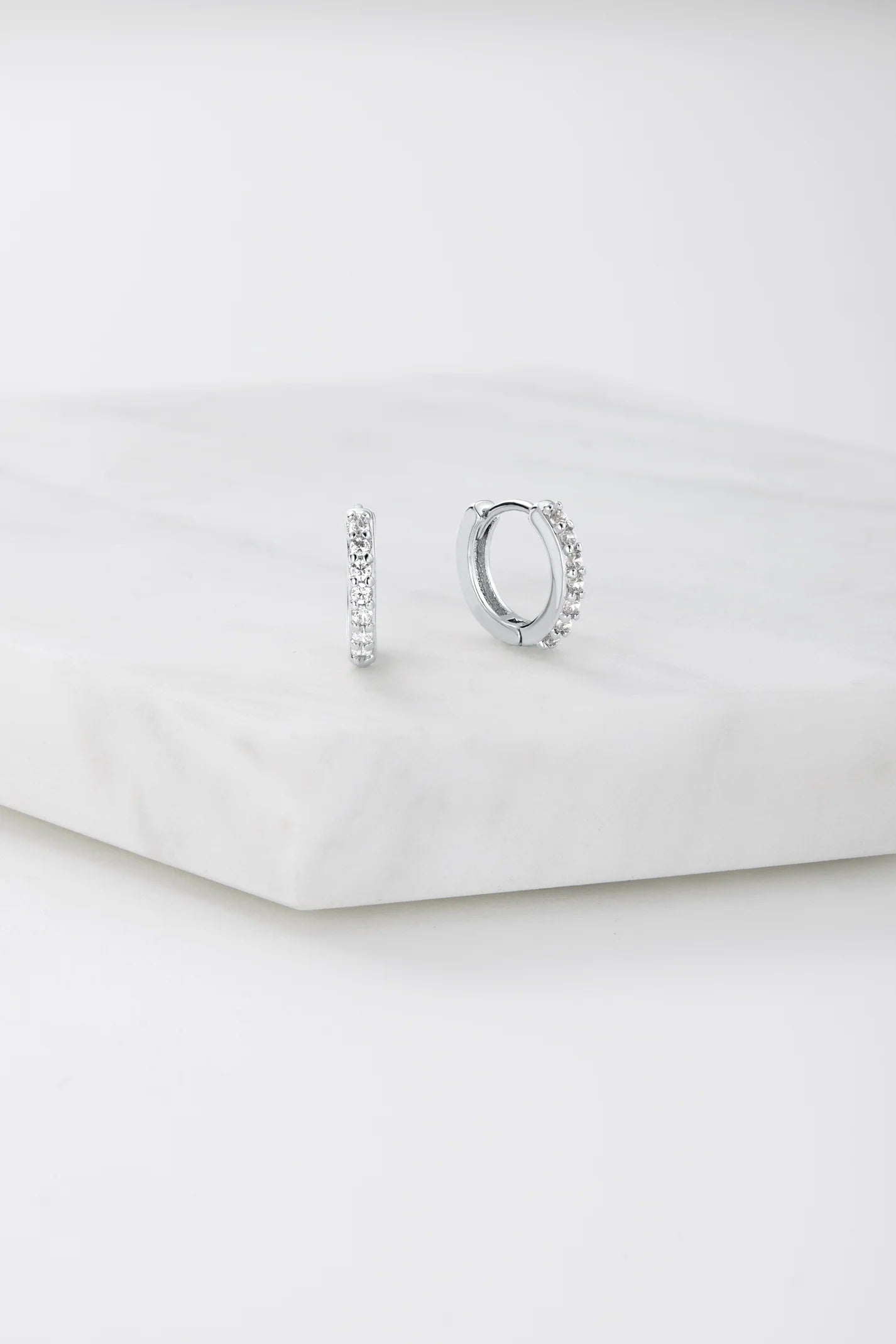 These small silver huggies are adorned with sparkling embedded crystals halfway around, offering a perfect blend of elegance and shine. A versatile piece that adds subtle luxury to any look, these hoops are ideal for both everyday wear and special occasions.