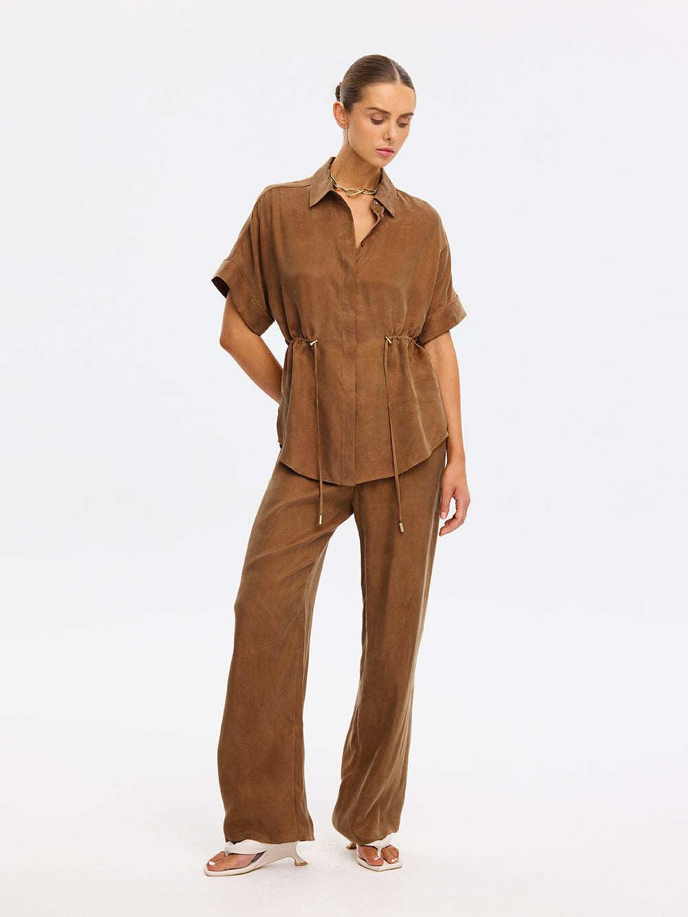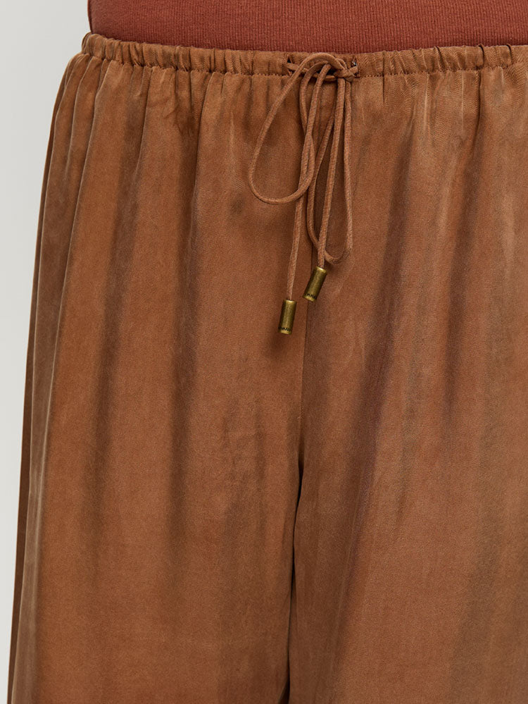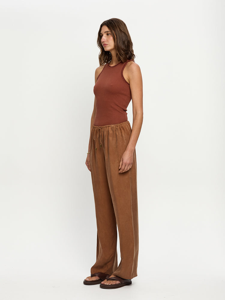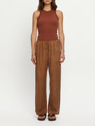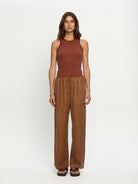 The Blythe Pant in chocolate brown features a relaxed straight-leg silhouette with an elasticated waistband and adjustable drawcord for everyday comfort. Easy and versatile, it offers a refined approach to relaxed dressing.