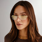 Finished in a bright gold frame with soft, clear mirror lenses.
