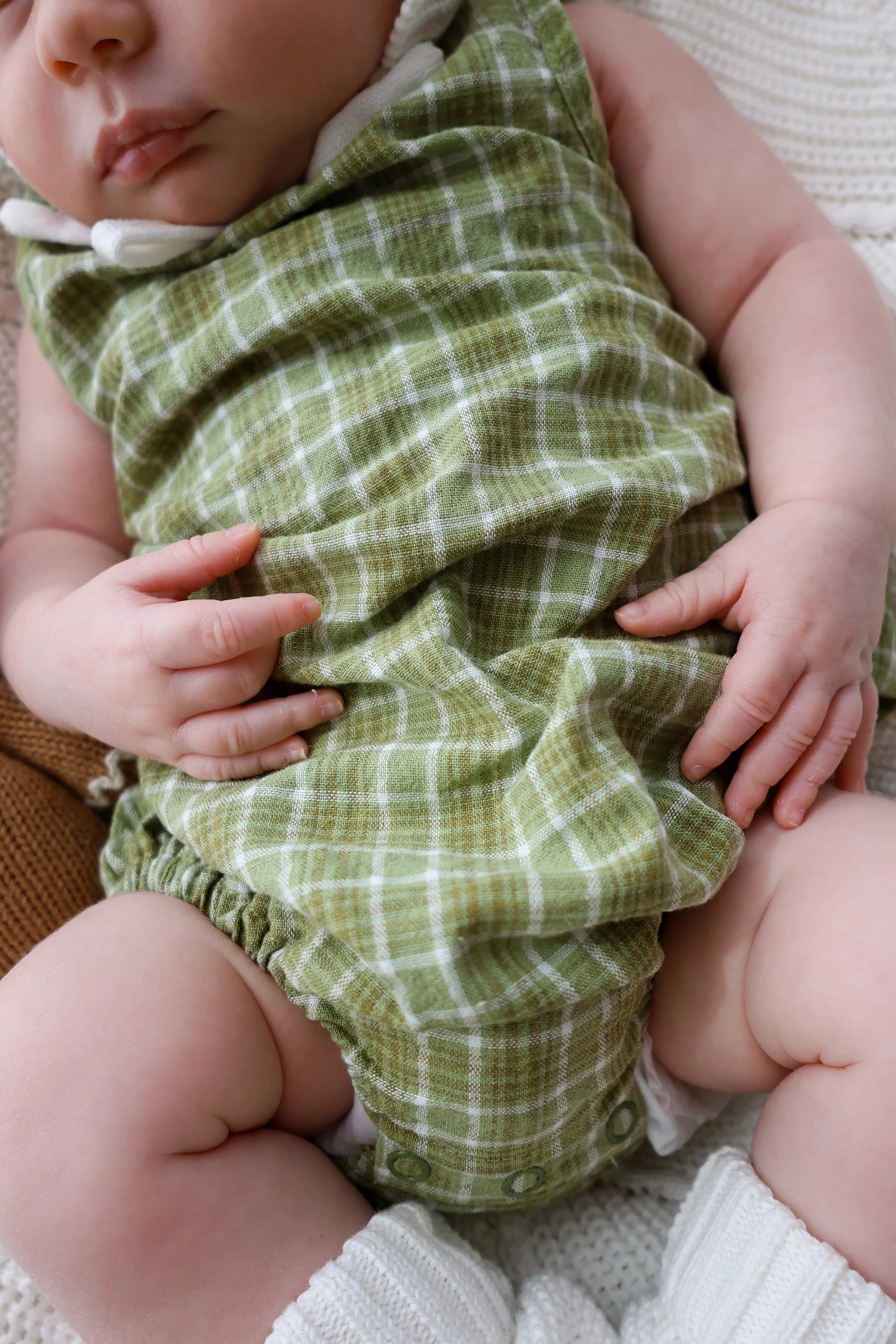Cotton bubble romper in our Thyme fabric. Functional snap buttons at back of neck and crotch for easy on/off and nappy changes. Mix and match with items from our Christmas Collection.