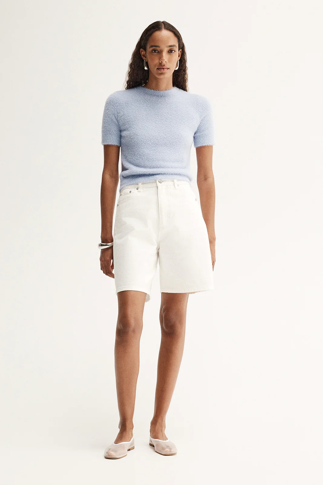 A past favourite, revisited - the Mochi Knit Tee is a reimagining of our popular Mochi Top with a refined silhouette and streamlined detailing. Made of the same soft, fuzzy knit fabric, this top is cut to a longer length than its predecessor, with a crew neckline, short sleeves, and ribbed hem. Styled with essential denim, this style effortlessly elevates casual looks and adds a point to interest to a more dressed up outfit anchored by tailored pants and structured skirts