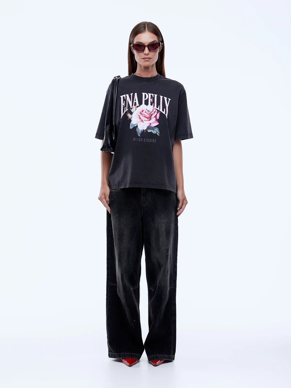 The Ena Pelly Rose Tee is made from soft cotton jersey with a boxy, relaxed shape and drop shoulders in vintage black. Finished with a feminine floral graphic and vintage wash, it delivers lived-in ease with expressive attitude.