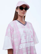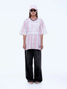 The Lunar Jersey is cut from cotton with contrast rib detailing and an oversized silhouette that drapes effortlessly in pink check. Highlighted by its all-over yardage print and monochromatic curved sleeve panels for a confident, street-ready finish.