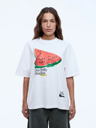 The Pelly Watermelon Tee is crafted from a recycled-cotton blend in a boxy silhouette with a vintage white finish. Detailed with a plastisol watermelon-themed graphic that adds a playful, summer-ready note.