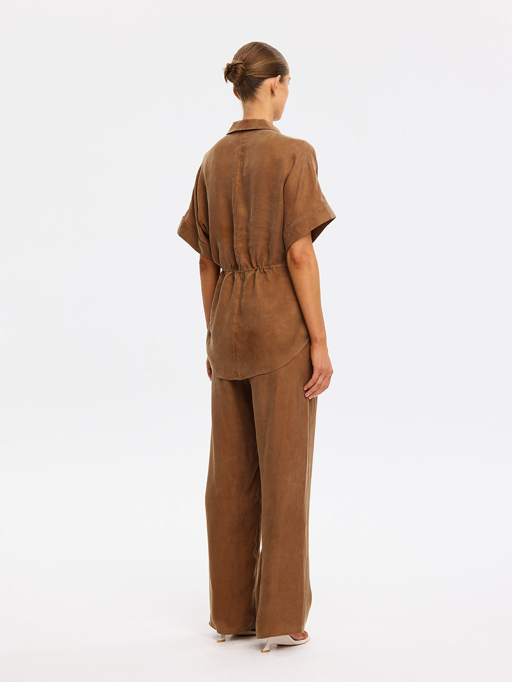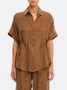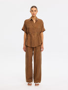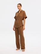 The Jaxon Top in chocolate brown is a relaxed silhouette featuring short sleeves and a concealed button-down front, complete with adjustable drawcords at the waist for a softly defined shape. Designed for ease and versatility, it blends relaxed tailoring with refined simplicity. Style with the matching Blythe Pant for a coordinated look, or pair with denim for effortless everyday wear.