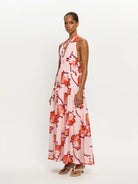 Lani is a floral print featuring hibiscus-inspired blooms in vivid shades of orange and red on a soft pink base. The Lani Halter Maxi Dress features a halter V-neckline with elongated ties, an elasticated waistband for subtle shape, and a tiered gathered skirt that drapes with effortless movement. Style with sandals for long lunches or elevate with heels for special occasions.